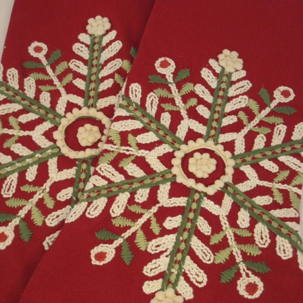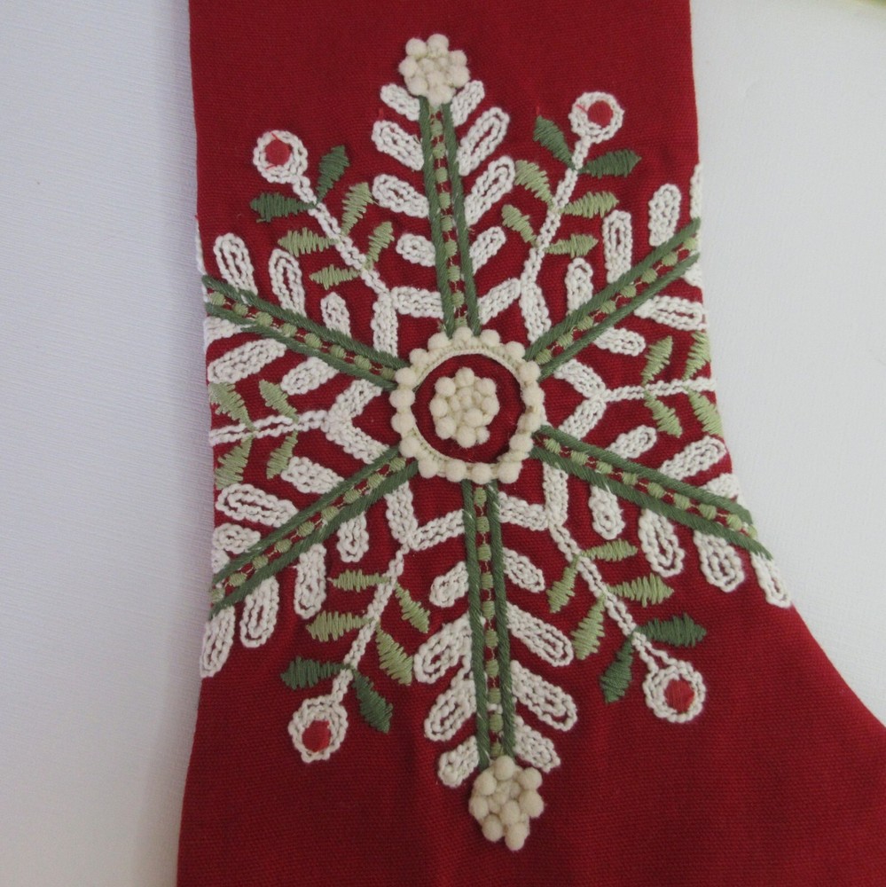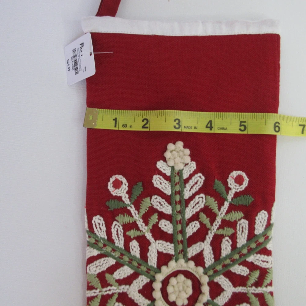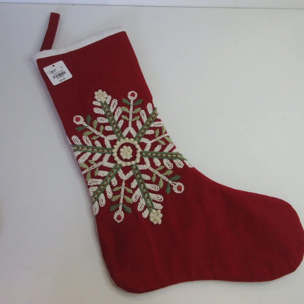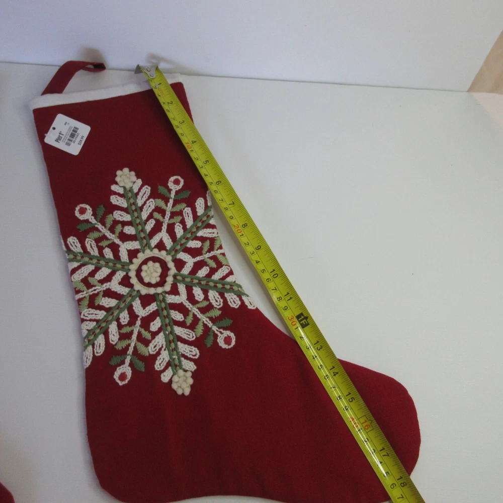 2 Pier 1 Imports Red White Green Snowflake Design Christmas Stocking Still has tags. One stocking has a snag in the fabric. Length: 18” 45.7 cm Width: 6” 15.24 cm