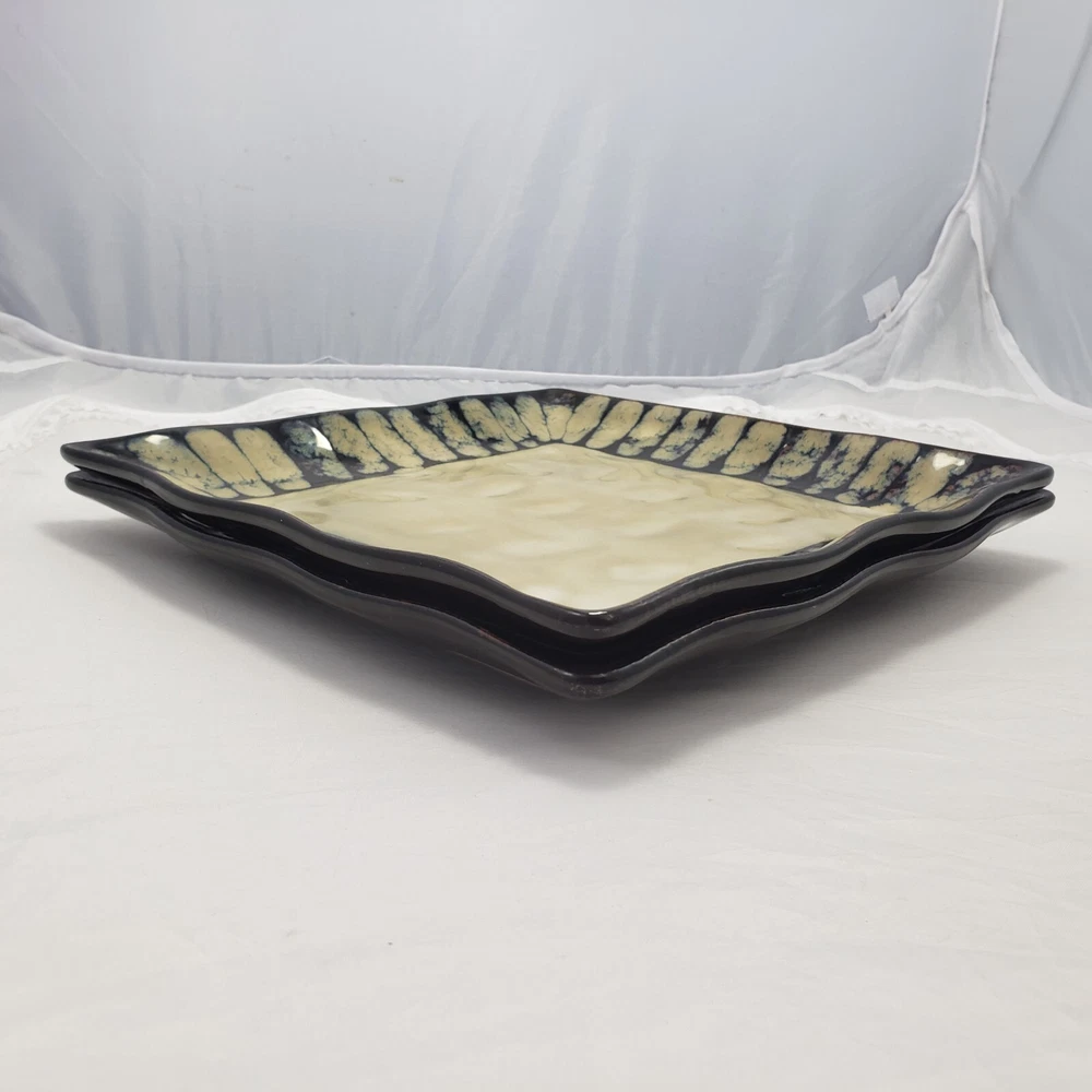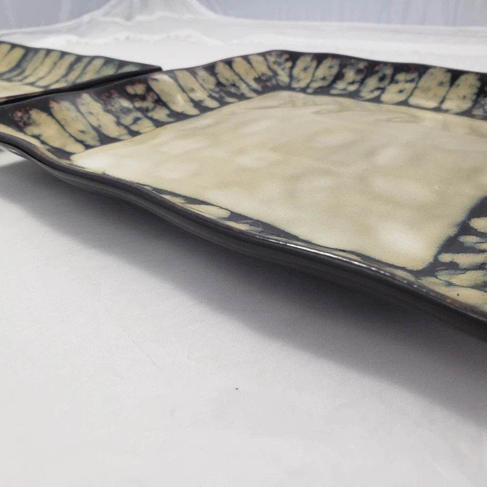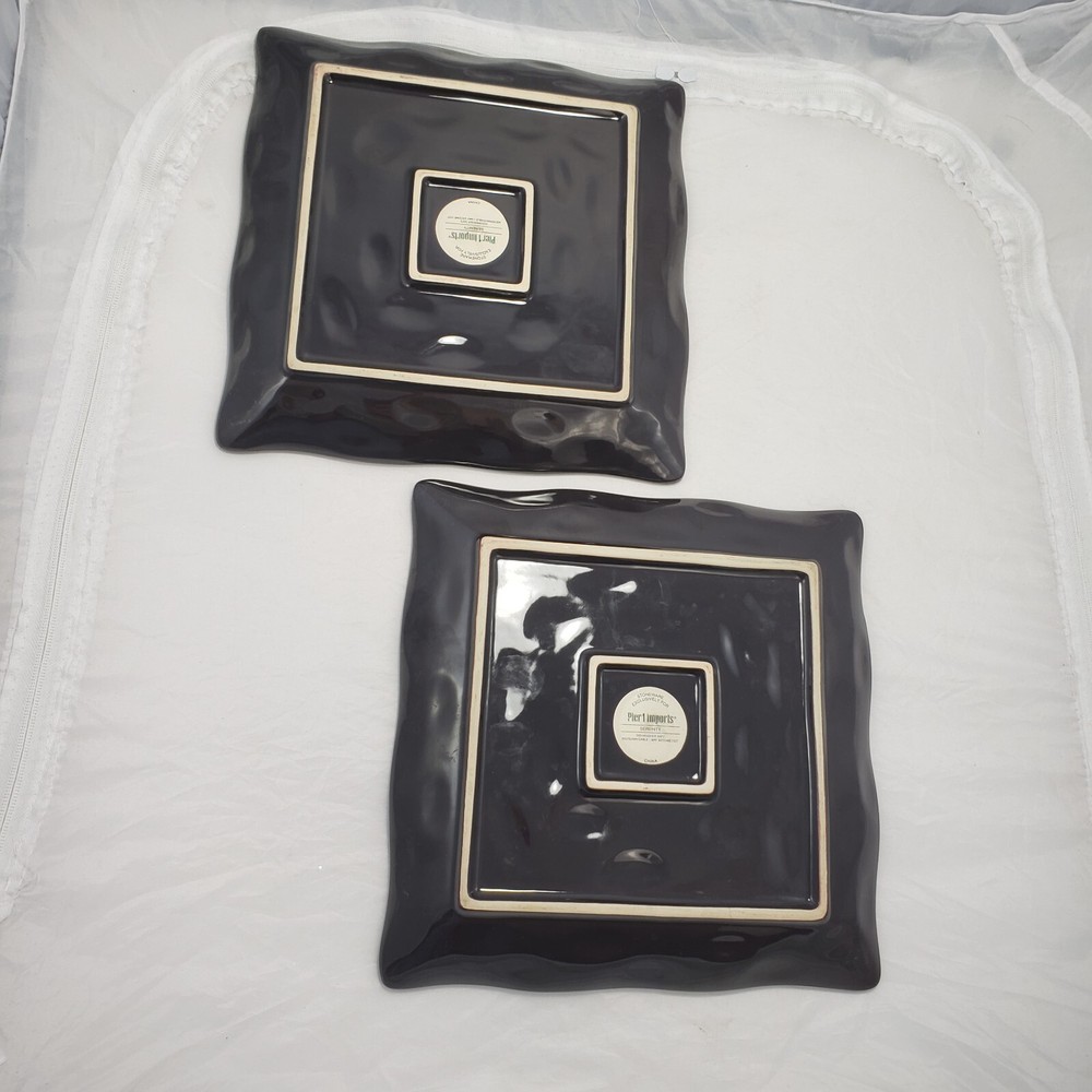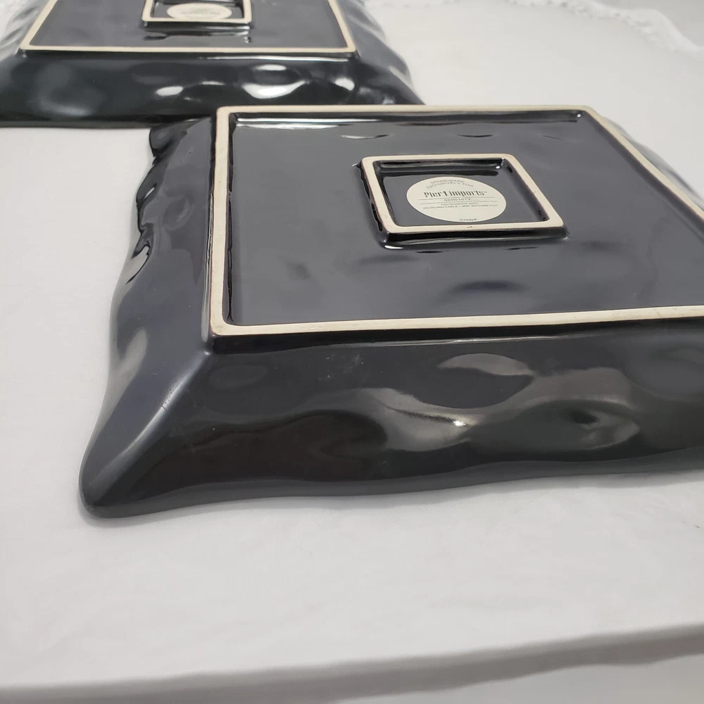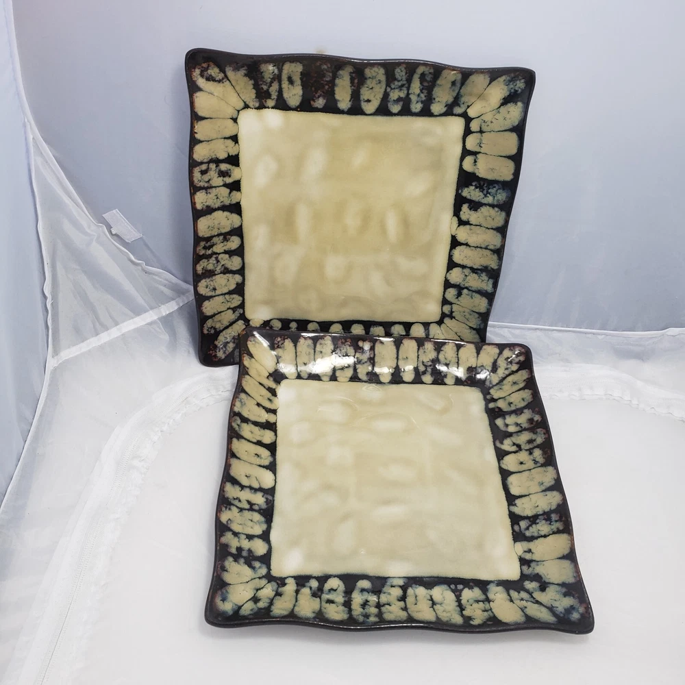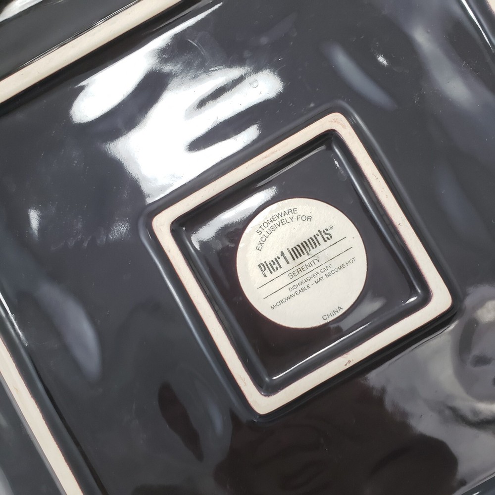 2 dinner plates or platters from the Pier 1 Imports Serenity line of dishware. Stoneware pieces measure 10" on each side, square. Dishwasher and microwave safe. Discontinued pattern. Wear from normal use and washing. No chips or cracks. Please see photos for exact condition.