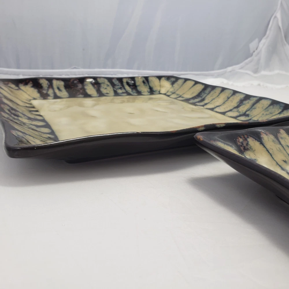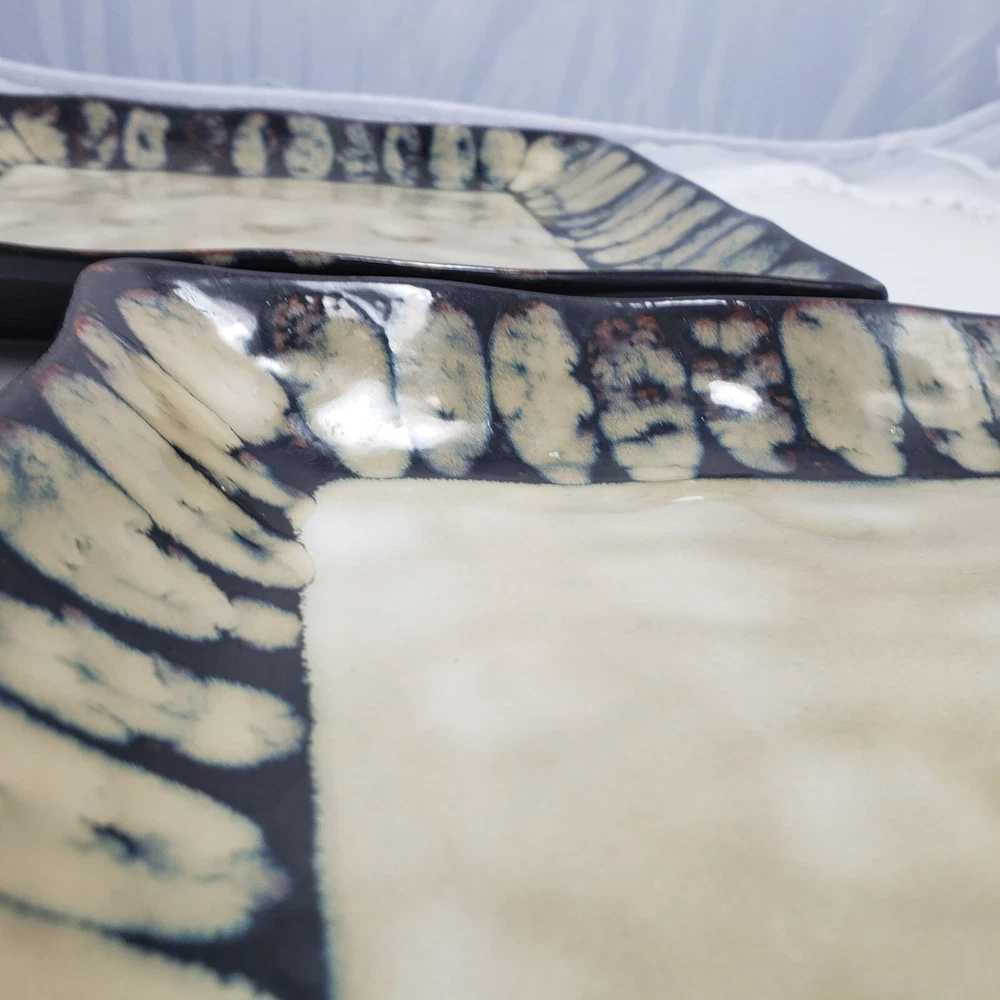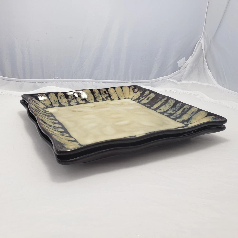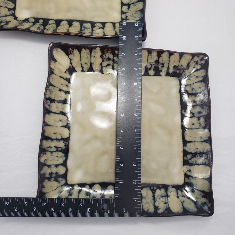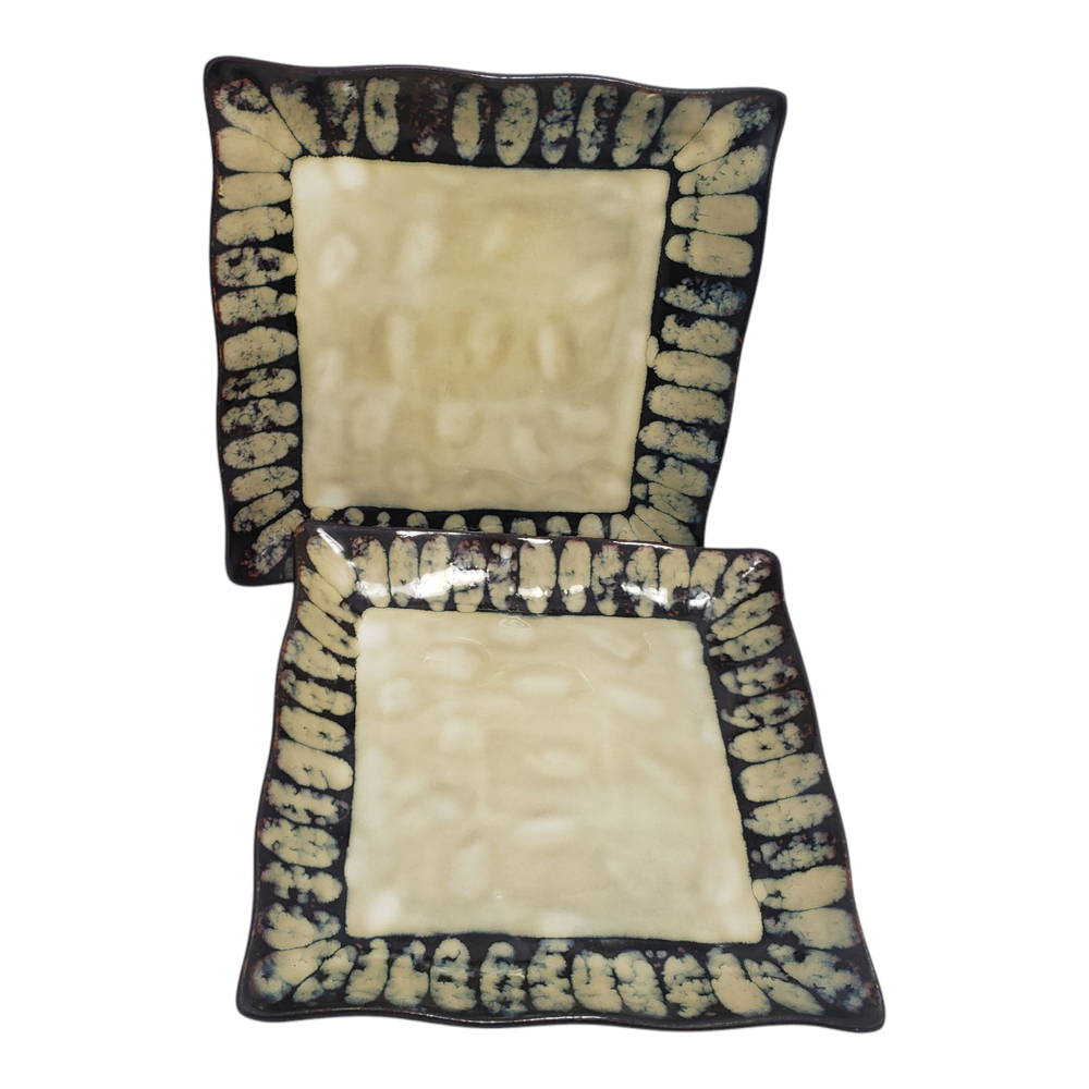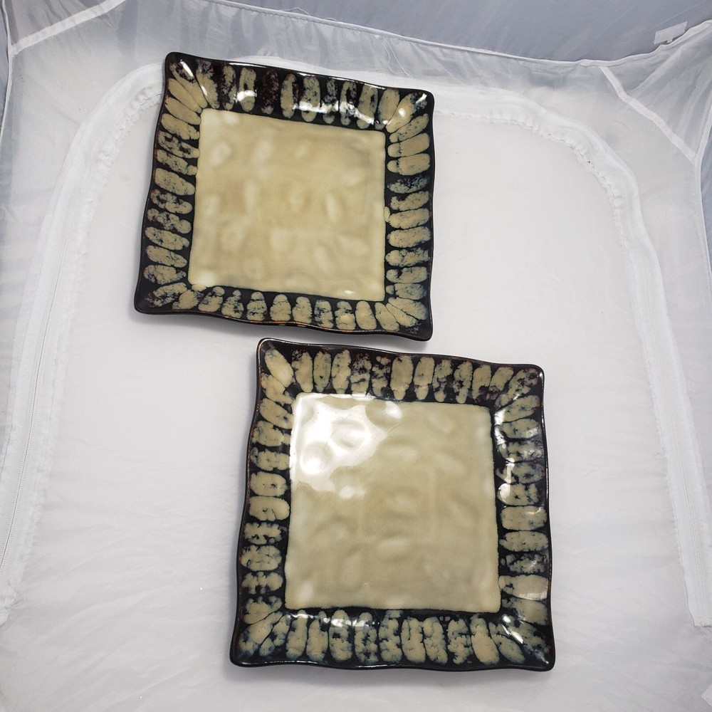 2 dinner plates or platters from the Pier 1 Imports Serenity line of dishware. Stoneware pieces measure 10" on each side, square. Dishwasher and microwave safe. Discontinued pattern. Wear from normal use and washing. No chips or cracks. Please see photos for exact condition.