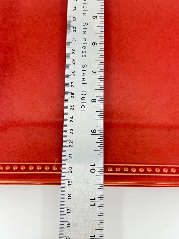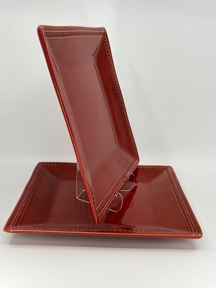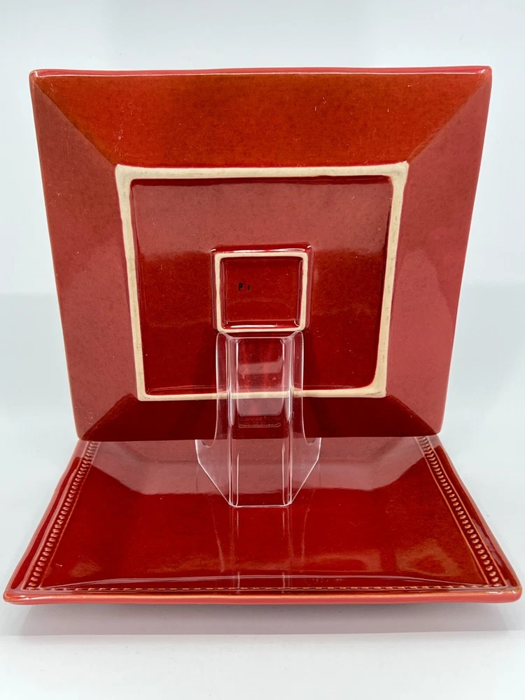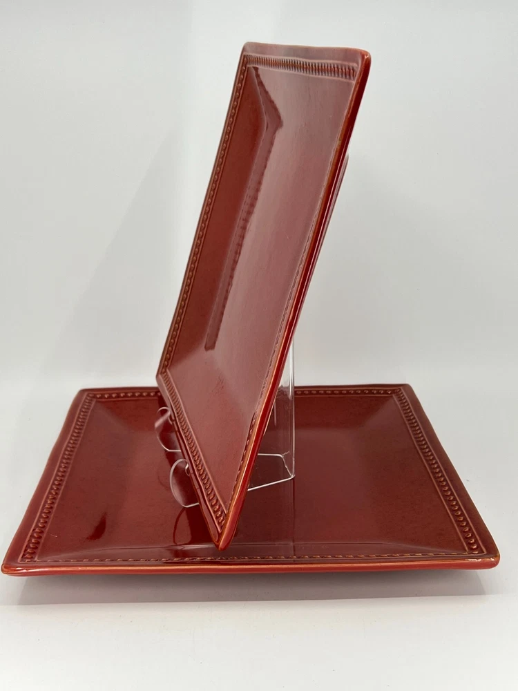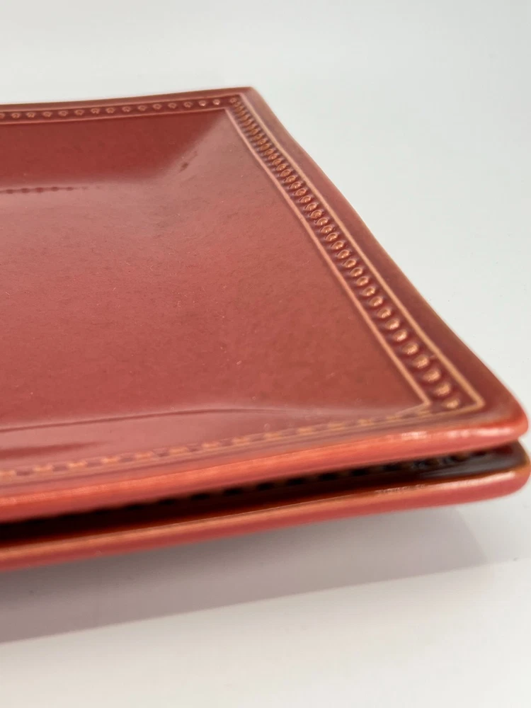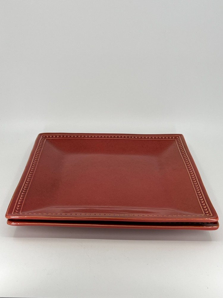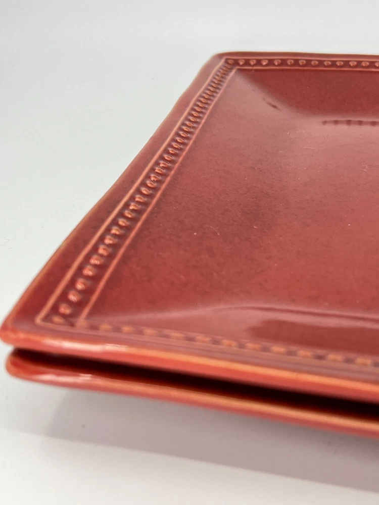 The 2 Pier 1 Imports Spice Route RED Paprika Dinner Plates are square-shaped, 10.5-inch stoneware plates with a vibrant red color and beaded edge pattern. Manufactured in Thailand in 1998, these contemporary-style dinner plates are versatile for all occasions and are microwave and dishwasher safe for easy use and cleaning. The glossy finish adds a decorative touch to any table setting, making them a unique addition to your dinnerware collection. Perfect for teens, boys, girls, adults, and unisex kids, these vintage-inspired plates are a stylish and practical choice for your home.