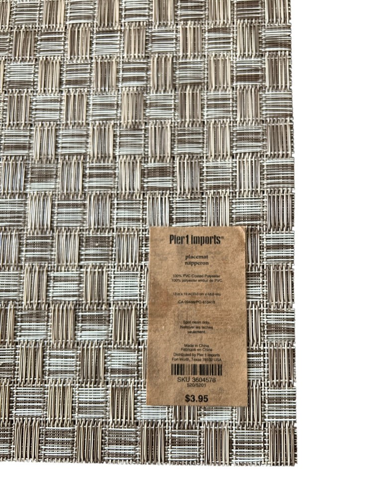 2 Pier 1 Imports Taupe Placemats. Size: 13" x 19". Set of 2. 100%PVC Coated Polyester. Look brand new, still has the tags on them. Yes, we wrap exceptionally well and ship immediately....