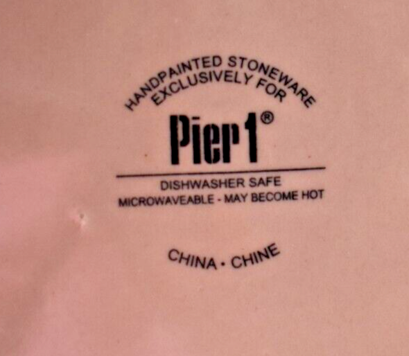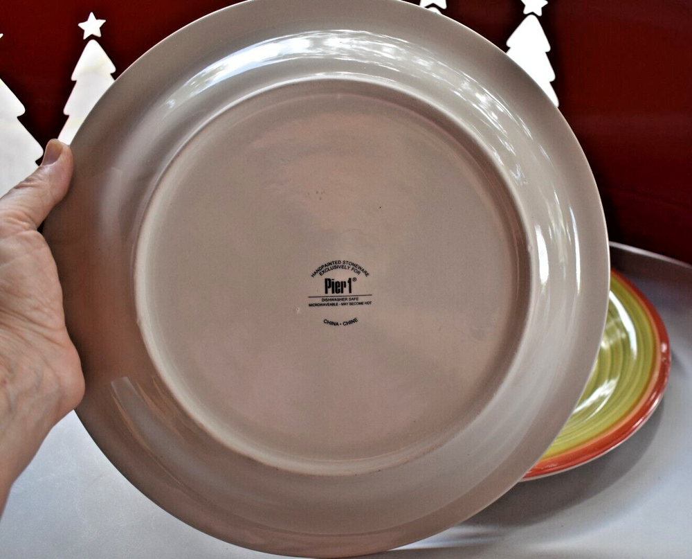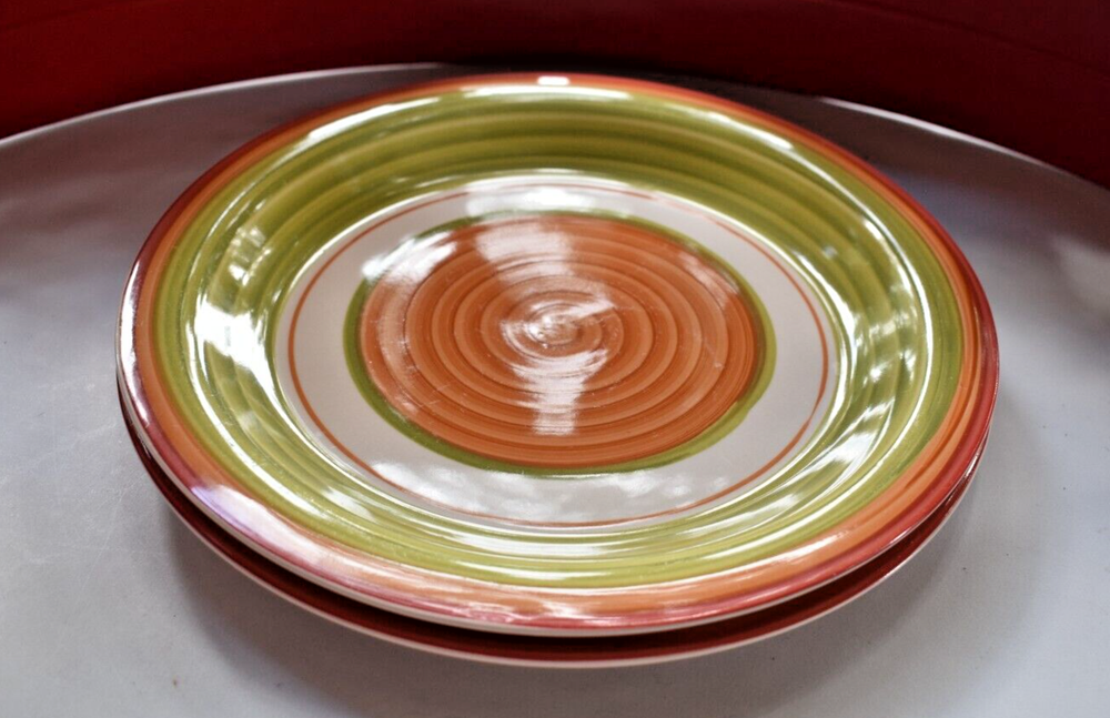 Add a touch of Mediterranean and Tuscan style to your dining table with this two-piece set of Pier 1 VALENCIA dinner plates. The plates measure 10 5/8 inches in diameter and feature a beautiful hand-painted design of rust, green, and peach swirls, with a smooth finish and no trim. These original stoneware plates were manufactured in China in the late 20th century using the pottery production technique and are part of the Pier 1 Imports product line. In addition to being decorative, these plates are also practical with features like being microwave and dishwasher safe. They are perfect for all occasions and will add a touch of elegance to any dining experience. Don't miss out on the opportunity to own these stunning plates that are sure to impress your guests.