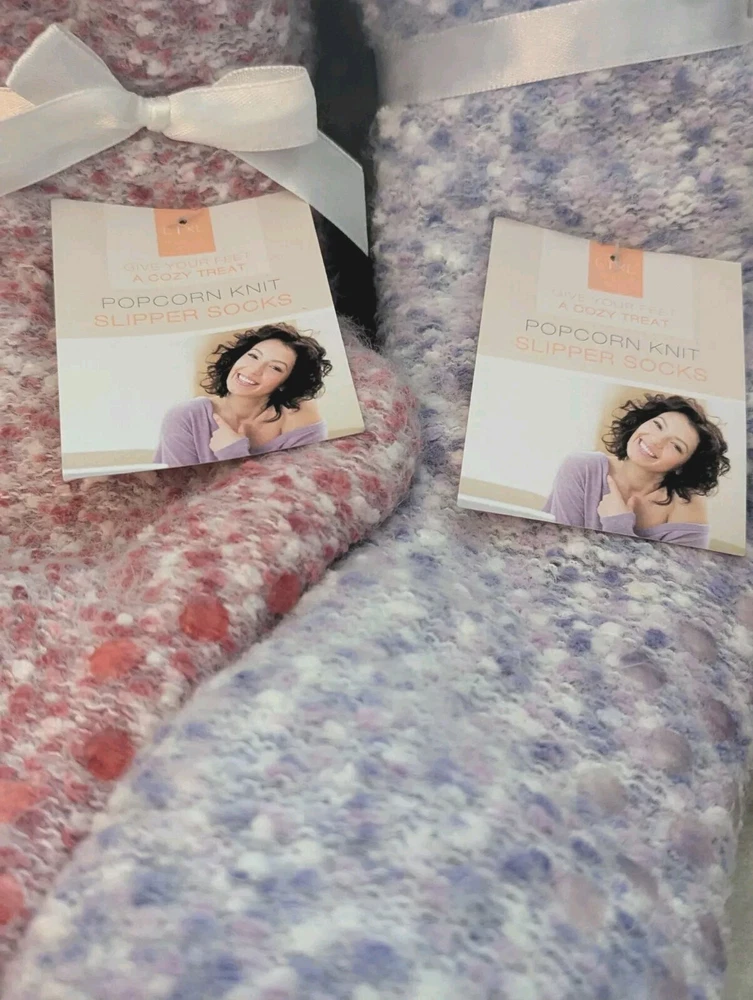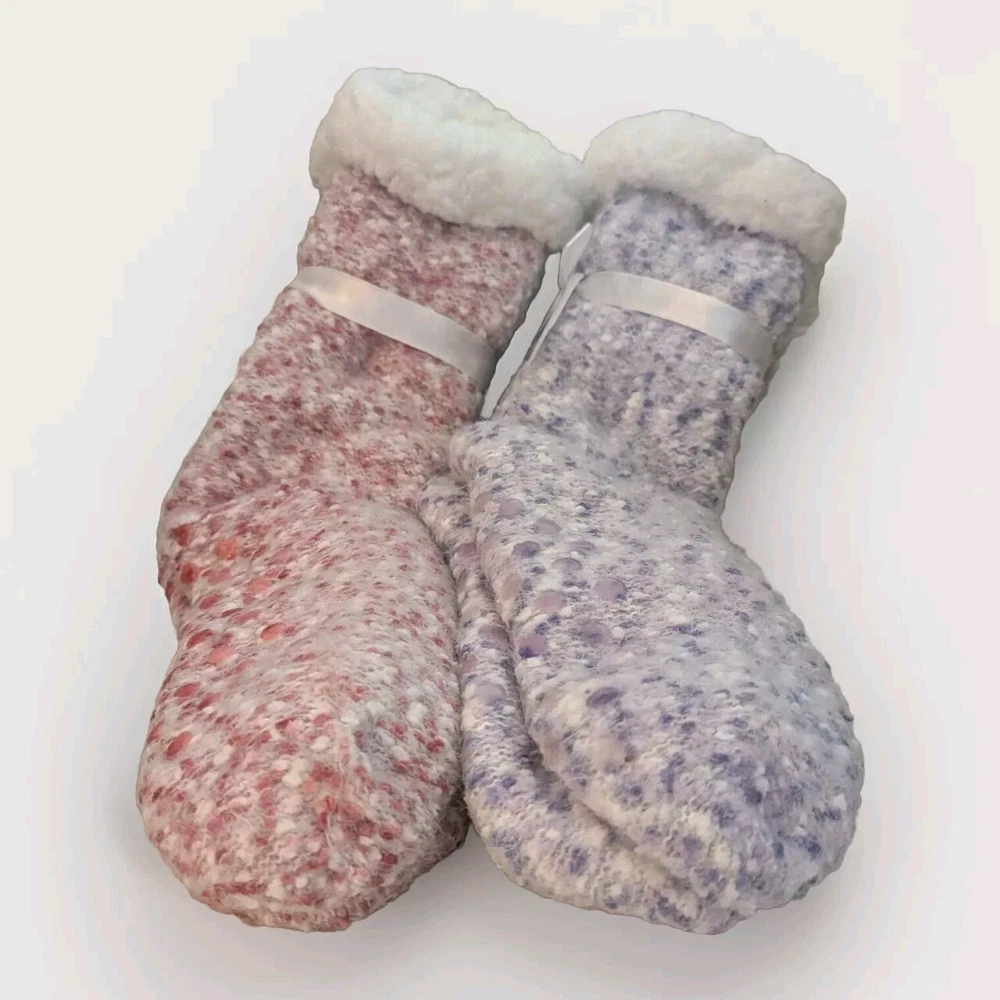 🌲⛄🌲 CHRISTMAS IS COMING !🌲⛄🌲 Treat your feet to a cozy and comfortable experience with these slipper socks. Made from soft polyester material, these mid-calf socks feature a full toe style and non-slip sole for added safety. The mottled pattern in pinks and purples adds a touch of fun to these everyday and casual socks. Perfect for winter, fall, and spring, these slipper socks are machine washable and easy to care for. They come in a pack of two pair and are ideal for women who love to lounge around in bed or on the couch. With this custom bundle, you can keep one pair and give one away as a gift! They come with a nice white ribbon around each pair! Get your hands on these warm and cozy slipper socks now and enjoy the ultimate comfort experience. Thanks for looking! Have a great day!