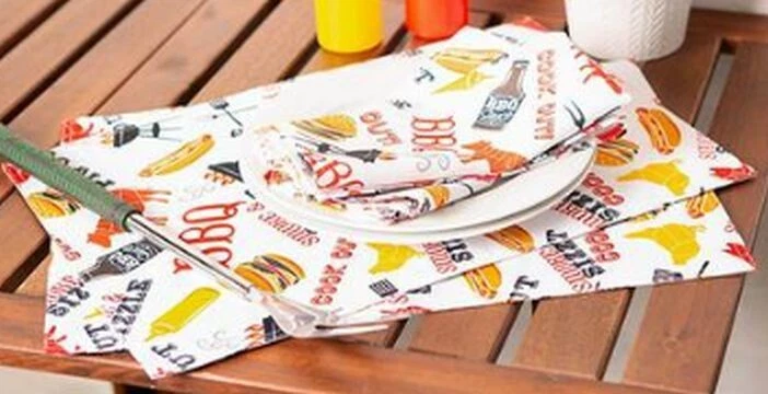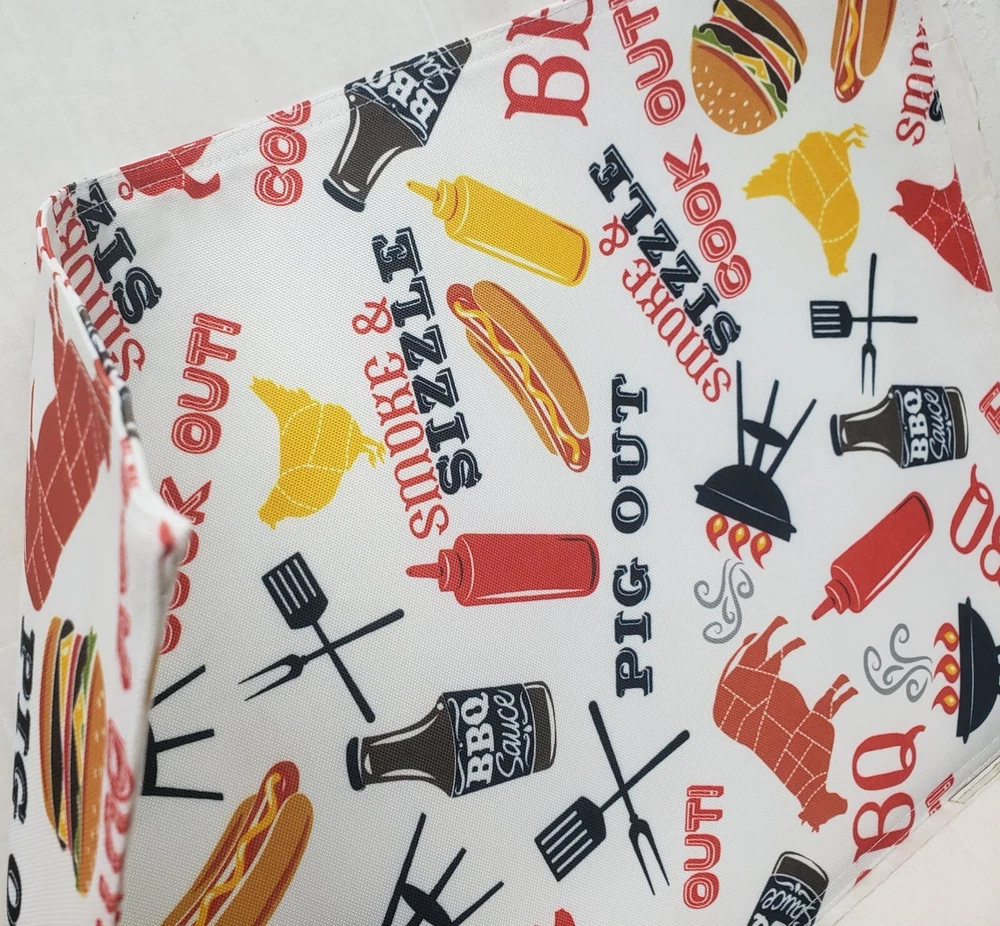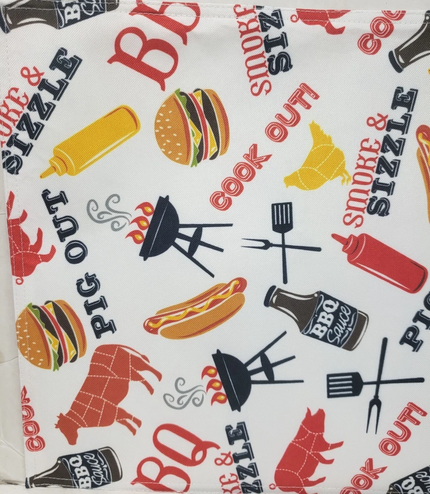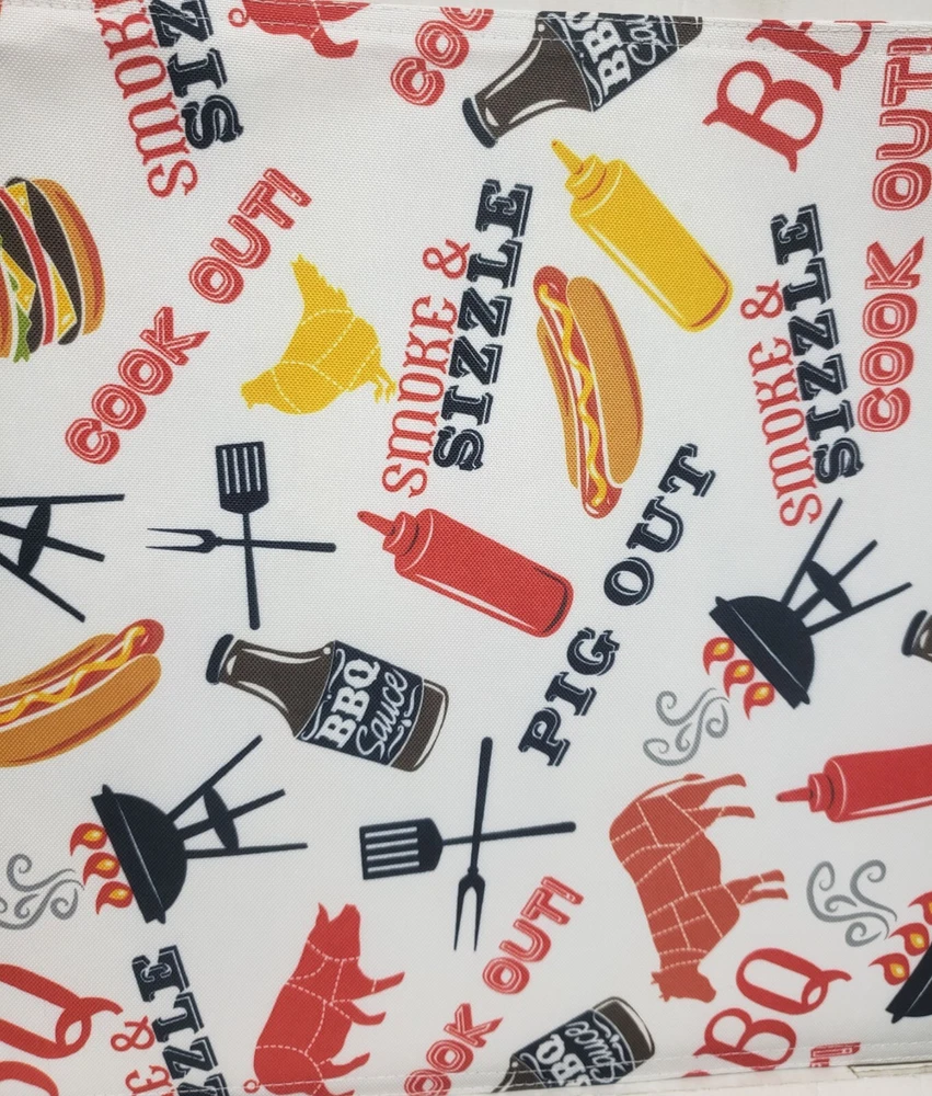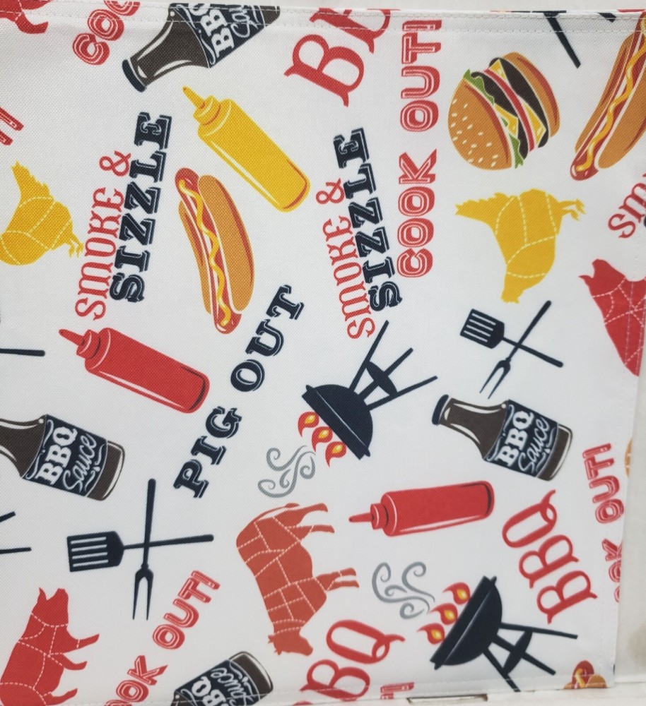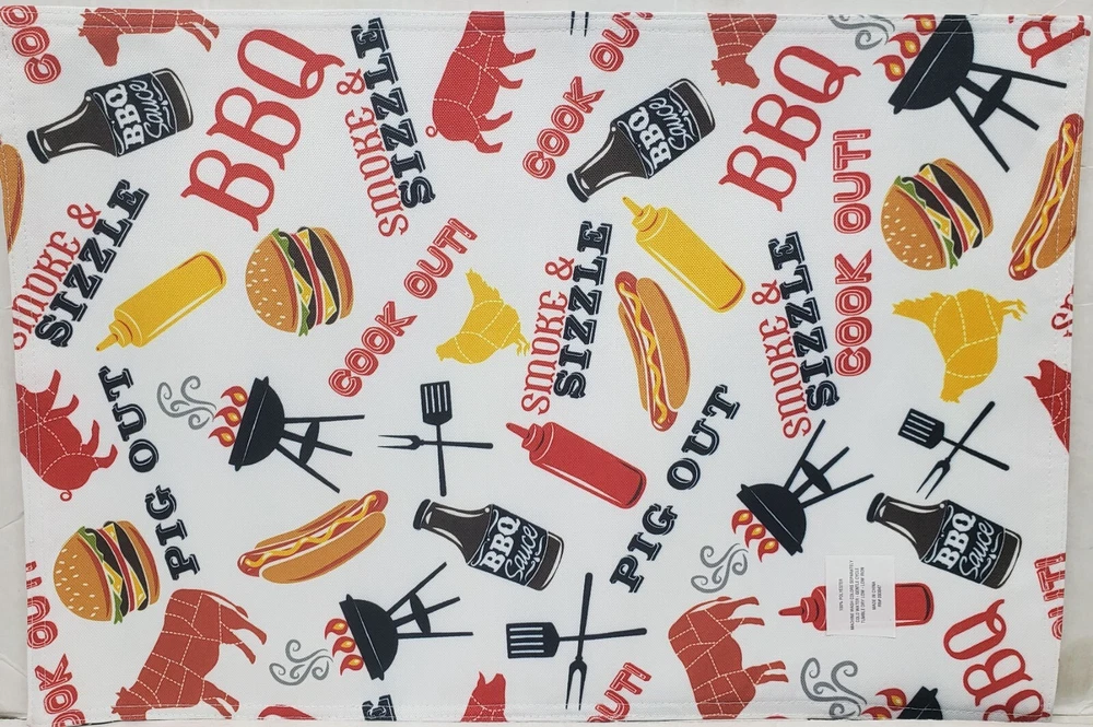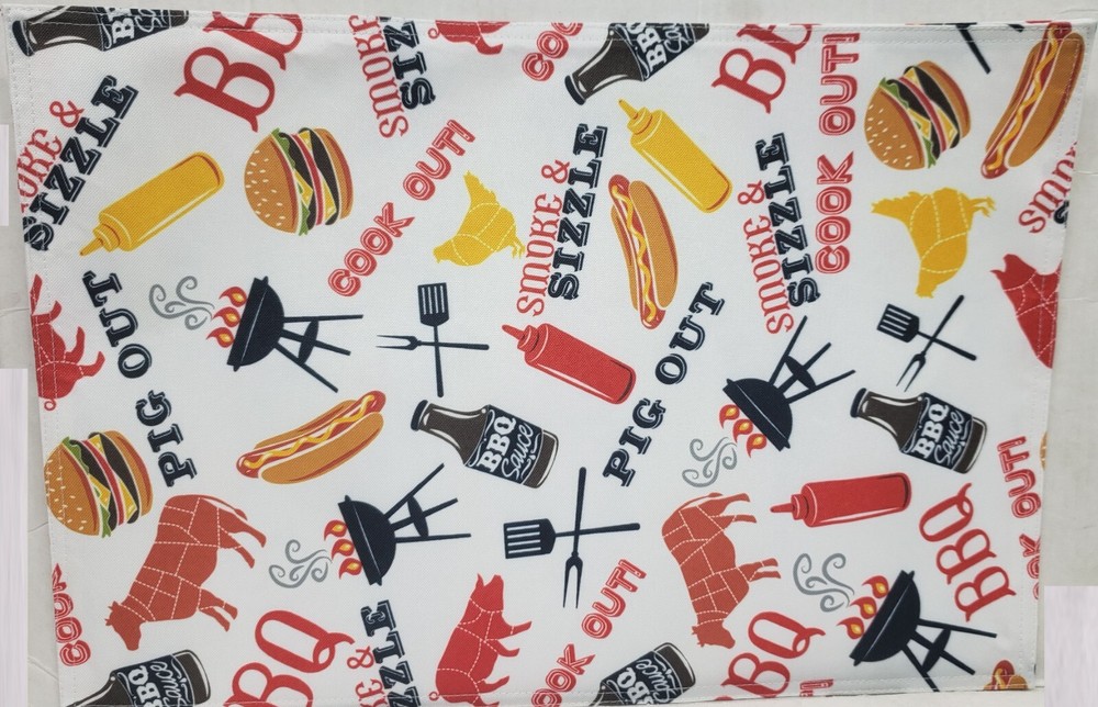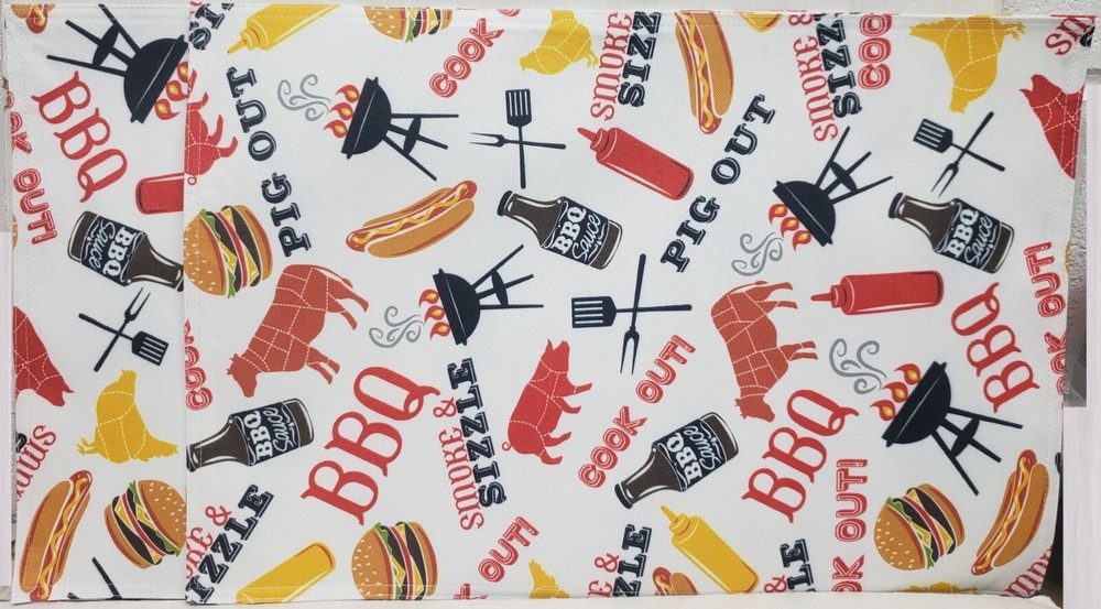 I'm selling a Set of 2 Same Fabric Printed Kitchen Placemats (approx. 13" x 19") SUMMER FUN PICNIK, COOK OUT, BBQ ITEMS as seen on pictures. Machine wash. Brand new, in the original package. Made by Design Imports in China. 100% Polyester. I may have a matching tablecloth & table runner. Please check out my other listings, and if you buy multiple items, please contact me and I will find out how I can combine your shipping I ship to USA only (or internationally using Global Shipping)