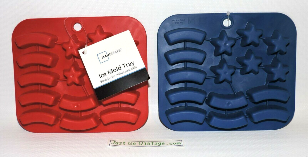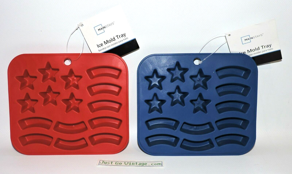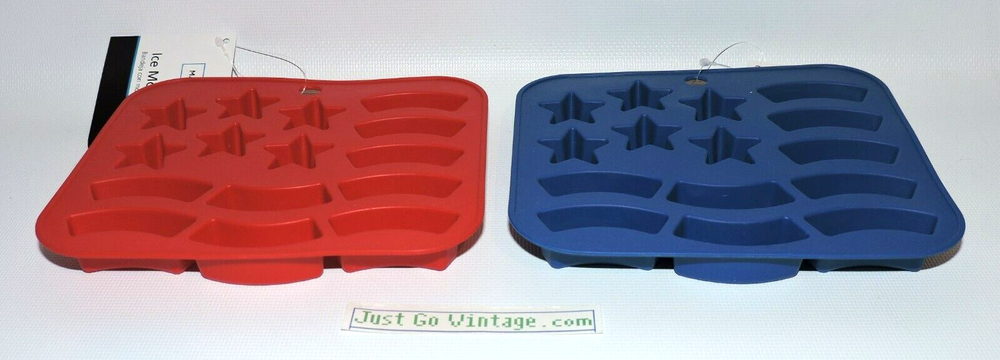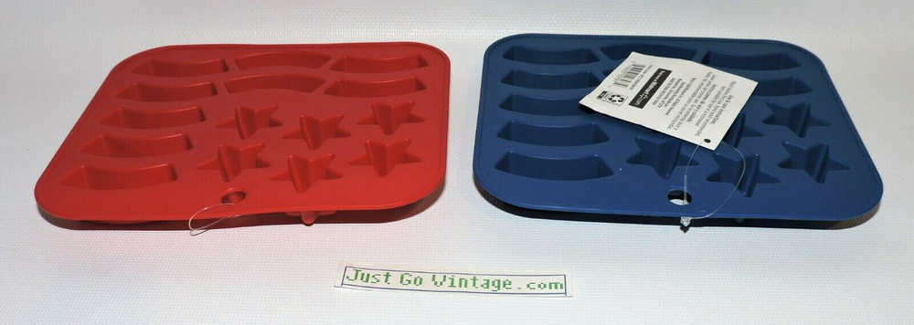 LOT of 2 Silicone Stars & Stripes USA Flag Ice Cube Candy Mold Trays, 1 RED & 1 BLUE, NEW, NWT BRAND NEW with Tags as shown. You get one SET of 2 per purchase. Buy multiple sets of 2 & save up to 20%! 1 Set will include 1 Red "Red Engine" & 1 Blue "Really Royal" Silicone Stars & Stripes Flag as shown in the photos. The trays measure 5.5" Tall x 6.5" Wide. The ice cube/candy size for the star is about 1.25" Wide (point to point), the size for the stripe is about 1.75" Wide x 0.5" Tall. Great for Memorial Day, 4th of July - Independence Day, Veteran's Day, or any patriotic holiday. FREE S&H! Please give me 1 business day to ship and let me know if you have any questions. Thanks!