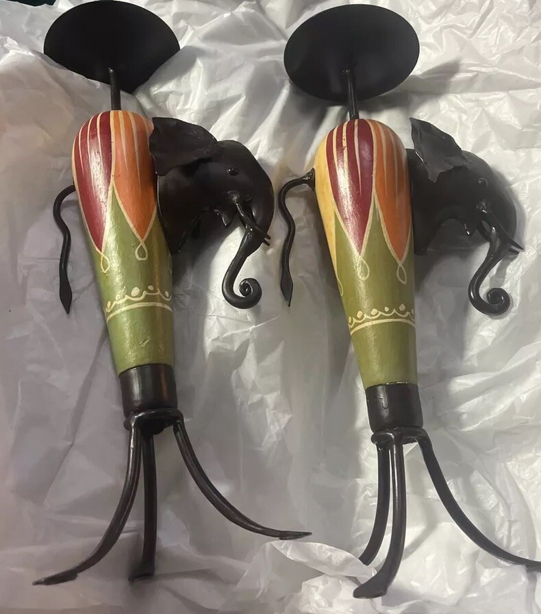 2 Vintage Pier 1 Imports African Elephant Wood & Metal Candle Holder. They have wear and some marks. sold as is