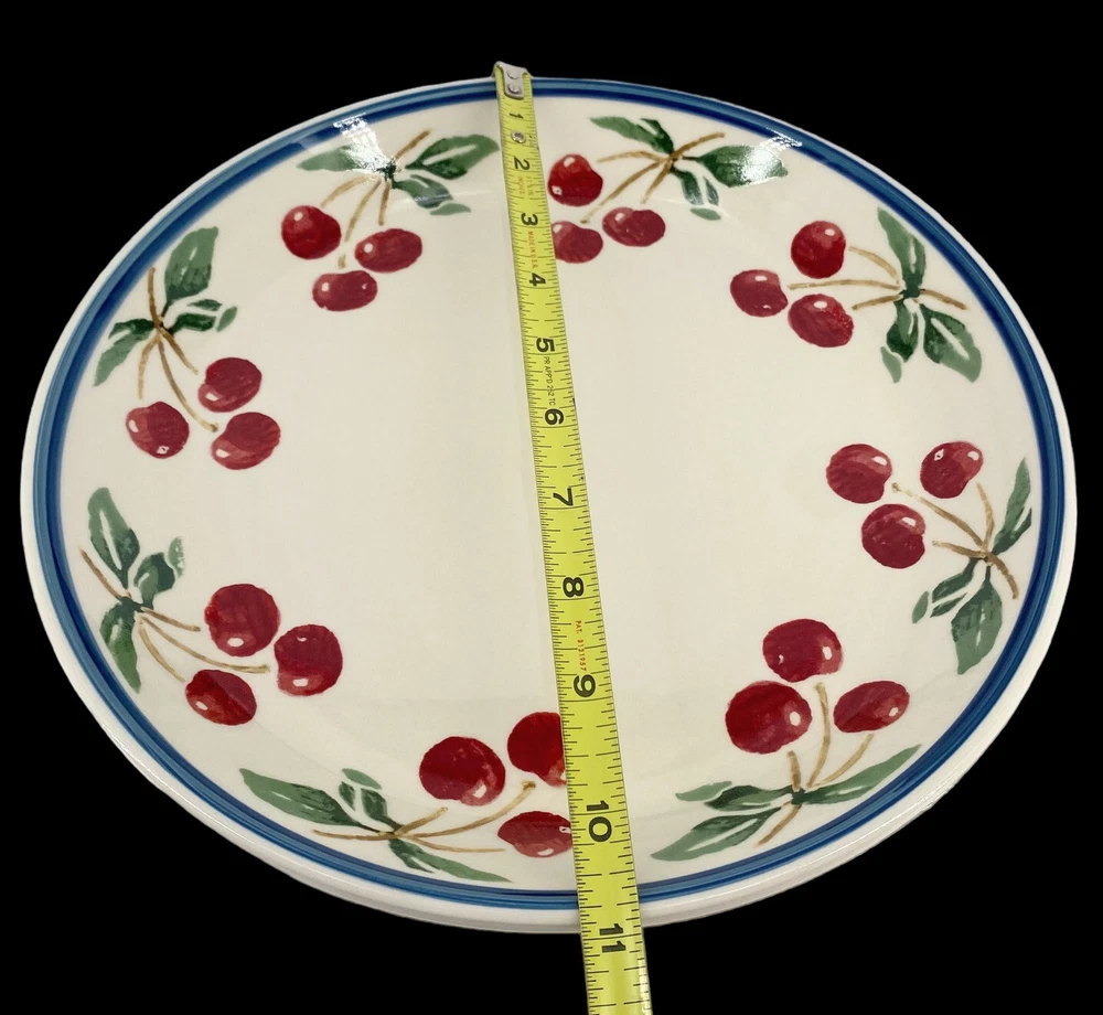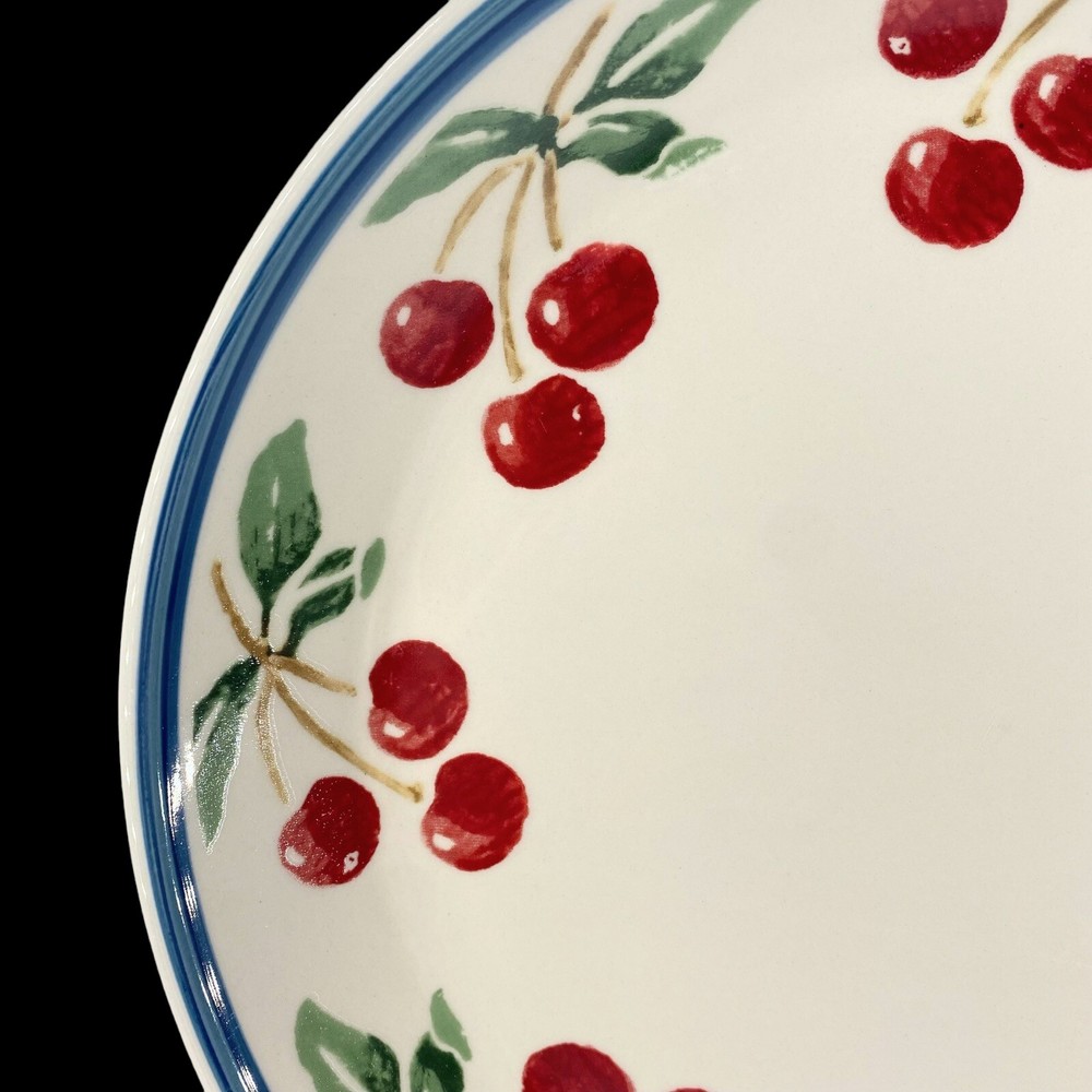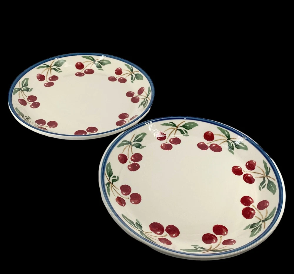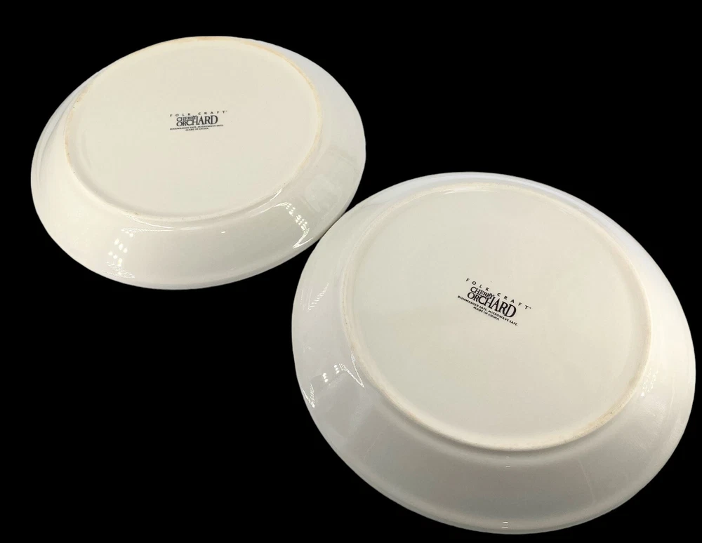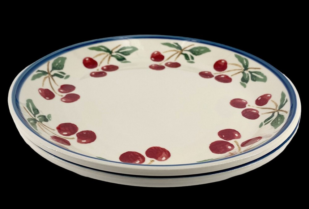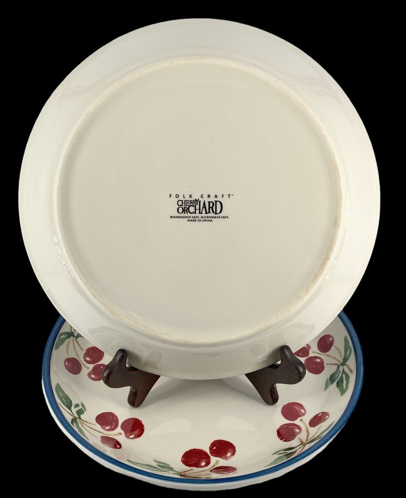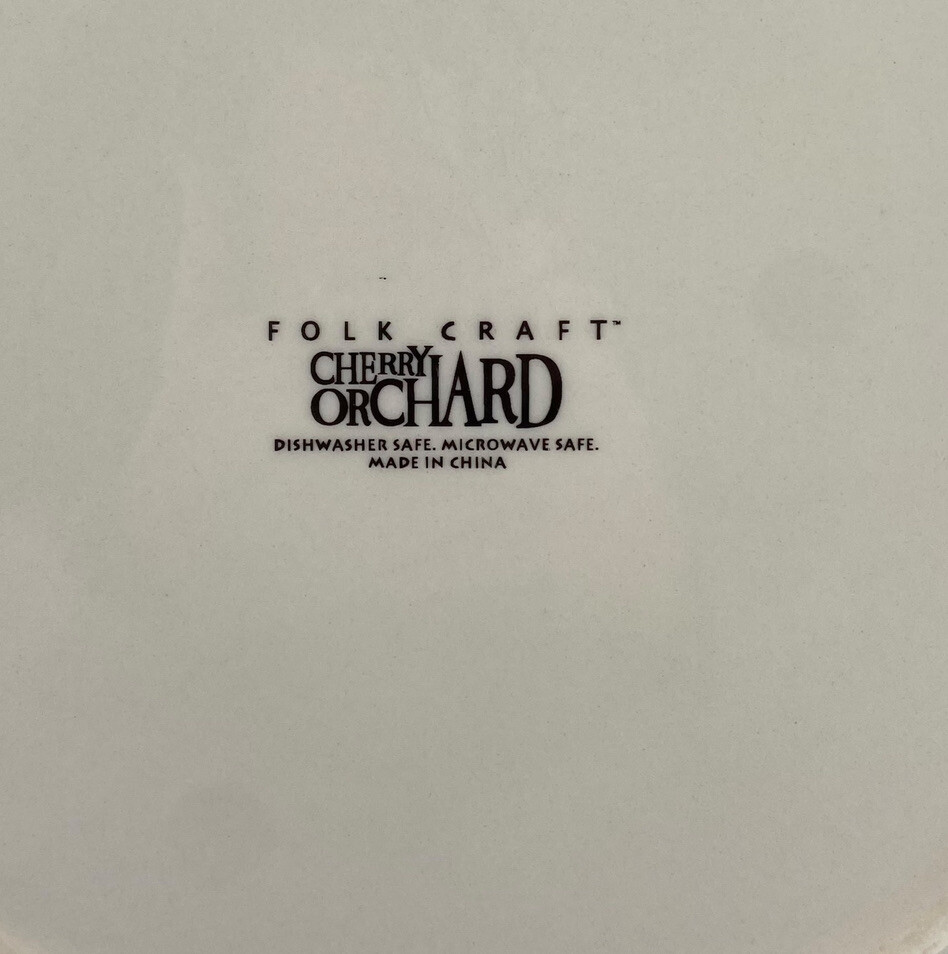 Description: Soft cream coupe dinner plates with 3 muted red cherries per branch & green leaves around the rim. A medium .25 inch blue trim edge. Both have some light utensil scratches but there are no chips or cracks. These are heavy stoneware coupe dinner plates from Folk Craft. Each plate weighs over 2 lb. They are coupe plates that have the edges lightly curve upward to create shallow depth within the plate. This light depth allows you to serve plates of food that are juicy, saucy or drizzled in gourmet oils. You could use them as pie plates or serving plates. These plates were designed by Susan Huemrich. There is another similar pattern with the same name called Cherry Orchard by “Mainstays”. This plate is not that manufacturer. This maker has a different cherry pattern (similar to the Mainstays) but there are 3 cherries per branch verse 2 cherries on the Mainstays line. This plate also uses a larger fruit design, longer green leaves, with a more vintage soft/faded pattern. -232070