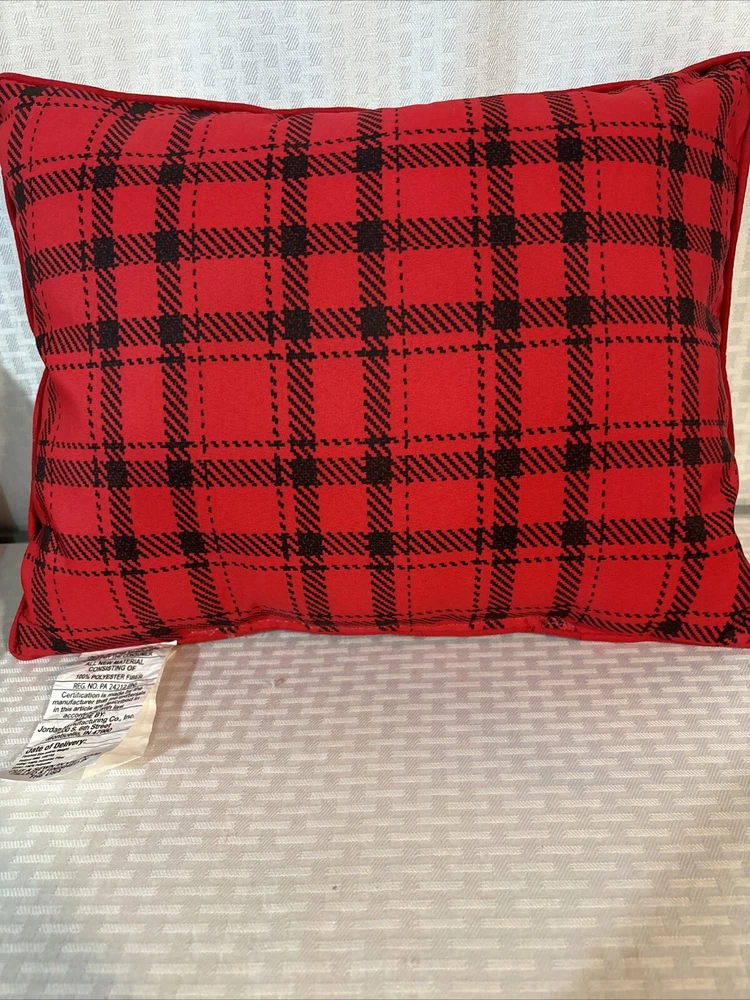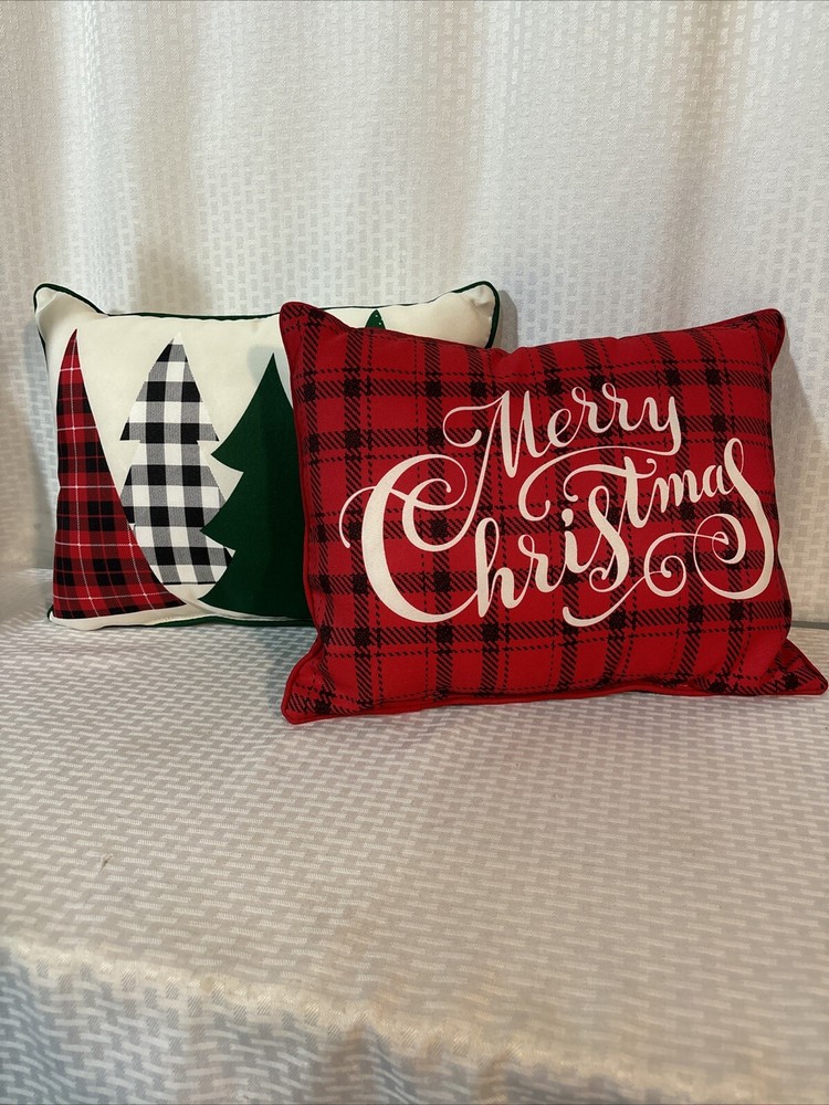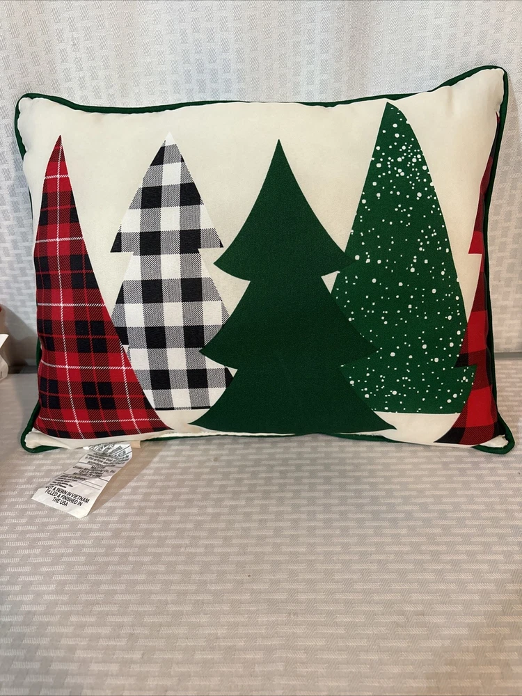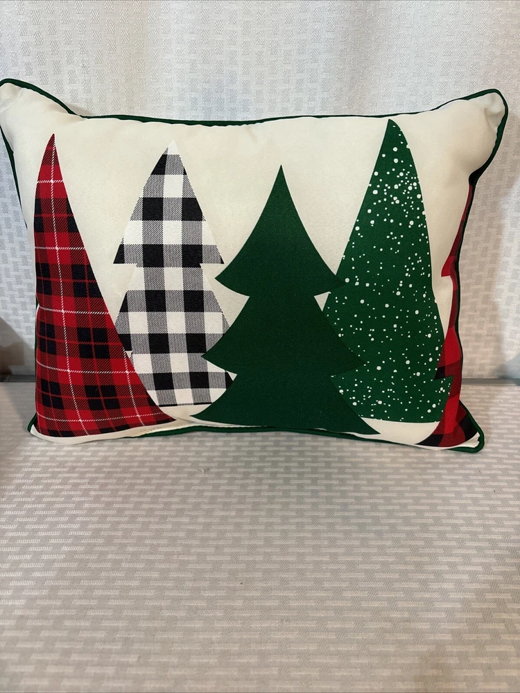 Great pillows. Trees plaid, solid & spotted, red , green, black & white. Red & black plaid Merry Christmas. No holes, tears or stains that I have noticed.