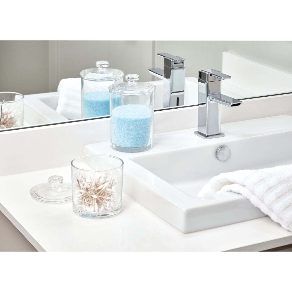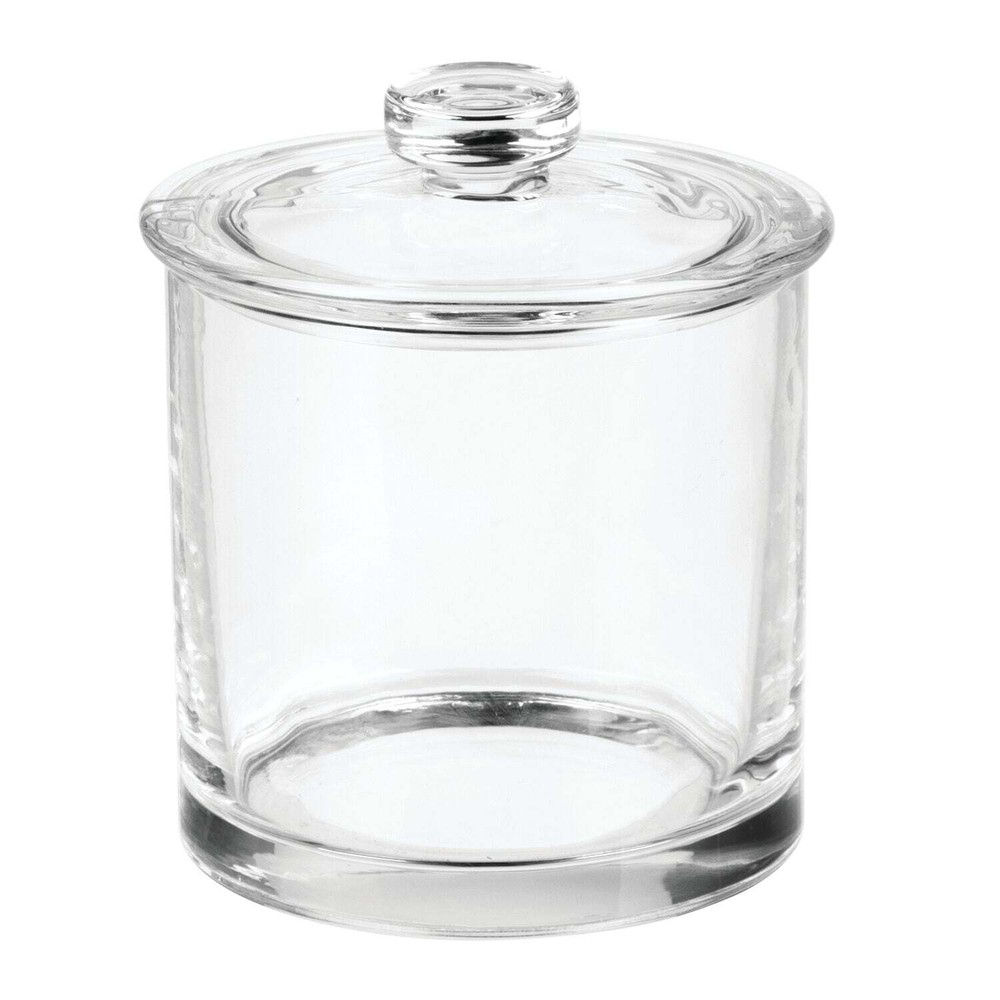 Organize your bathroom vanity in style with the iDesign Glass Canister with Lid. This lidded jar is ideal for storing cotton balls, swabs, and rounds as well as makeup sponges, cosmetic pads, and more. The convenient removable lid protects items inside the canister from dust and water while also keeping them clean and dry until ready for use. The durable glass jar and lid stand up to every day use and are easy to clean with mild soap and water. Measuring 6.35" x 6.85" x 4.65", this jar is perfect for use in compact spaces. With iDesign by InterDesign, you can #LiveSimply every day. BATHROOM VANITY CANISTER: Ideal for storing cotton balls, swabs, and rounds as well as makeup sponges, cosmetic pads, and more CONVENIENT REMOVABLE LID: Protects items inside the canister from dust and water while also keeping them clean and dry until ready for use STYLISH DESIGN: Classic design with clear finish matches a variety of home and bathroom decor styles MADE WITH DURABLE GLASS: Durable glass jar and lid stands up to every day use and is easy to clean COMPACT SIZE: Measures 6.35"" x 6.85"" x 4.65"" and is ideal for use in compact spaces on countertops, shelves, and in cabinets
