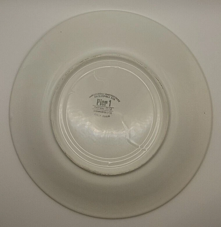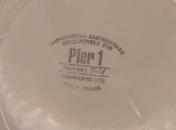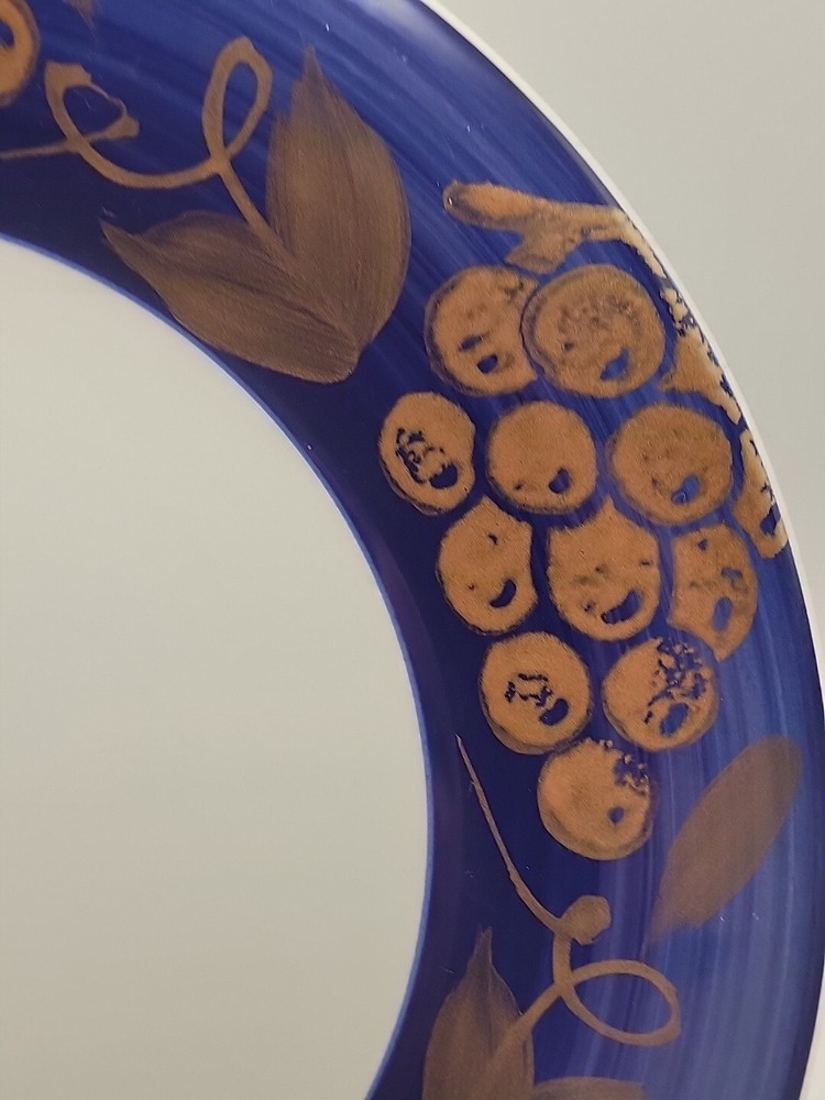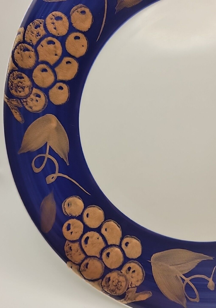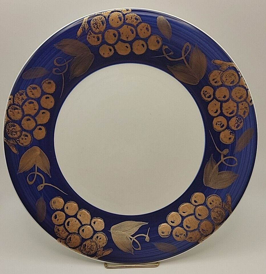 Pair of Pier 1 dinner plates in the Tuscany Gold pattern. This discontinued pattern features a cobalt blue border with gold grapes. Both in excellent condition with no chips, cracks, or crazing....