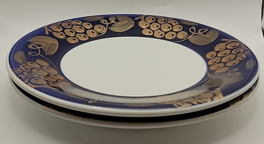 Pair of Pier 1 dinner plates in the Tuscany Gold pattern. This discontinued pattern features a cobalt blue border with gold grapes. Both in excellent condition with no chips, cracks, or crazing.