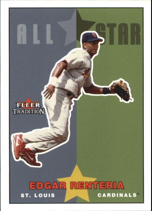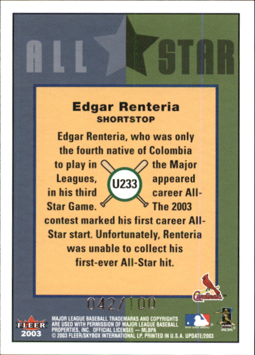 2003 Fleer Tradition Update Glossy #233 Edgar Renteria AS/100 Front Back Sport: Baseball Set: 2003 Fleer Tradition Update Glossy Year: 2003 Item#: 233 Player: Edgar Renteria Team: St. Louis Cardinals BB Attributes: Serial Numbered Brand: Fleer Tradition Update Manufacturer: Fleer Inc. Grading Company: Raw Grade SetType: Parallel Item Condition: Near Mint/Mint 2014 Beckett Collectibles, LLC. All Rights Reserved Powered by: Thank you for choosing Burbank Sportscards, the sports cards superstore. We offer a large selection of singles across all sports. Visit our ebay store to view all our items available. Our Shipping Policy We offer Free Standard Shipping to all Domestic customers. Options for Expedited shipping are also available at checkout. For our international customers, shipping is $9.99 for the first item, and $0.25 for each additional item. Note to all customers: To qualify for combines shipping, we ask our customers to add items into the shopping cart. Please note, we do not combine orders that are placed separately. Our Service: Generally, our turnaround is super quick as we process and send out orders same day payment is received. Stock Availability: We do our best to ensure all items are in stock; however, in case of the rare stock out, the customer will have the option for a replacement card, or we will process a refund so the order is not held up. Our Images: Many of our images are stock photos from Beckett archives. They are a representation of the actual card you would receive. If you have any questions regarding the item you're interested in, please feel free to ask (serial numbers and relic pieces may vary) Moreover, in a case of a wrong or defective photo, please notify us, so we can adjust it. Other FAQ's: -When buying multiple cards, do you top load each item? No; however, we do try to insure all items are shipped securely. If you wish to have all of your cards top loaded it is a paid service and can be arranged. Please email for more details. For other questions, please feel free to ask. Thank you.