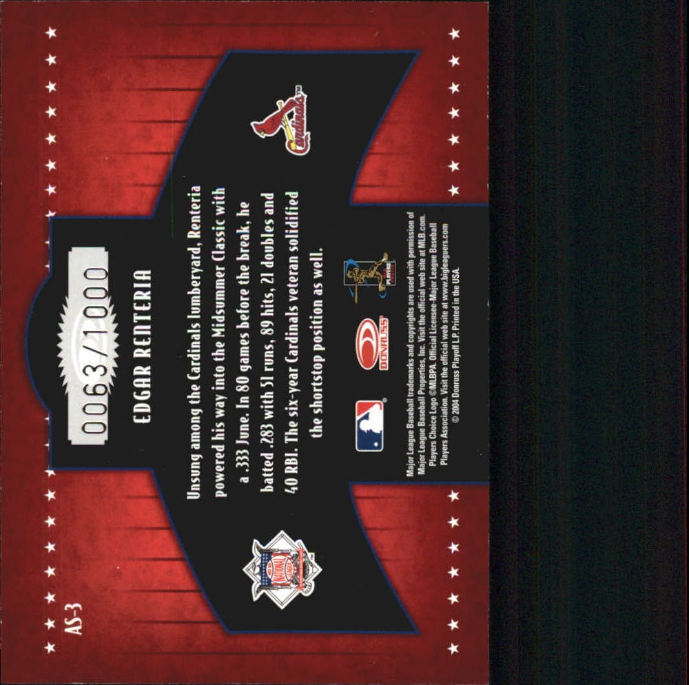 2005 Donruss All-Stars NL #3 Edgar Renteria /1000 - NM-MT Front Back Sport: Baseball Set: 2005 Donruss All-Stars NL Year: 2005 Item#: 3 Player: Edgar Renteria Team: St. Louis Cardinals BB Attributes: Serial Numbered Brand: Donruss Manufacturer: Donruss/Playoff Grading Company: Raw Grade SetType: Insert Item Condition: Near Mint/Mint 2014 Beckett Collectibles, LLC. All Rights Reserved Powered by: All orders are shipped in a minimum of a bubble mailer with a box for larger orders or orders with graded cards. All domestic orders are shipped with delivery confirmation. Listings may have stock photos. If the title & the picture do not match. It is probably an error in the picture, PLEASE ASK BEFORE YOU BUY to make sure. If the card is serial numbered, it may no longer match the one pictured, as we have literally millions of cards. ASK before you buy if there are ANY questions. We combine shipping. For normal sized/thickness cards, we ship up to 20 for the $4 fee. Odd-sized, thicker and graded cards may be more expensive. Domestic S&H is $4 for first class mail Graded or Uncirculated cards may be more to ship. We are no longer shipping international orders. If you live outside the United States and wish to place an order, please set up an account with one of the international drop shipping companies or one of the companies in the U.S. that will warehouse your items for you. <!--##BCILogoStart##--> <!--##BCILogoEnd##-->