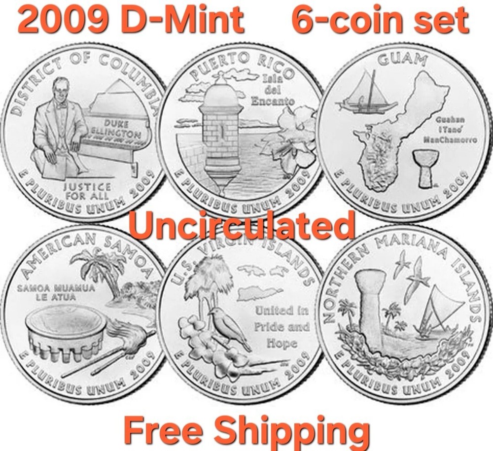 D.C. and Territory Quarters 2009 D Brilliant Uncirculated 6 coin Set (loose coins for your albums). You'll receive 6 Brilliant Uncirculated D.C. and Territory Quarters - Denver (D) complete P set of the 6 BU Satatehood Quarters issued in 2009: District of Columbia, Puerto Rico, Guam, American Samoa, Virgin Islands, and Northern Mariana Islands Shipped with tracking Looking for the 2009 5 coin P set as well? https://www.ebay.com/itm/335623952189?mkcid=16&mkevt=1&mkrid=711-127632-2357-0&ssspo=OMrSLTuqRLm&sssrc=2051273&ssuid=OMrSLTuqRLm&var=&widget_ver=artemis&media=COPY