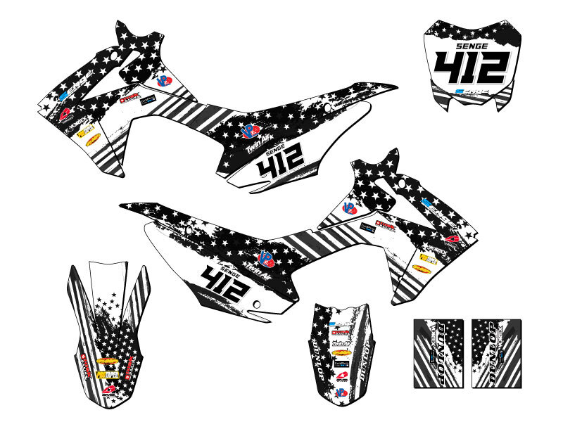 Graphics Kit for Honda CRF 110 (Photo above is of a different model and is only to show style. This set will fit your CRF 110 correctly) Senge Graphics Inc state-of-the art digital printing processensures a HIGH DEFINITION, long lasting product that will stand out from the others. We use highly aggressive adhesives along with ultra-thick over laminates to create extremely durable graphics that are guaranteed to stay where you put them and scratch free even through the toughest riding conditions. We use premium UV resistant inks that keep your graphics from fading for up to 8 years. Decals Included: Left side radiator shroud Right side radiator shroud Left side gas tank Right side gas tank Front fender Rear fender Swingarms Left and right fork guards Airboxes Left side number plate (When you choose "Number Plates Included" or "Number Plates with Rider I.D." option) Right side number plate (When you choose "Number Plates Included" or "Number Plates with Rider I.D." option) Front number plate (When you choose "Number Plates Included" or "Number Plates with Rider I.D." option) Product Highlights: 22 MIL overall thickness Ultra High Gloss Thick Protective Coating FREE Rider I.D. with all Number Plates Made in the USA 2013 2014 2015 2016 2017 2018