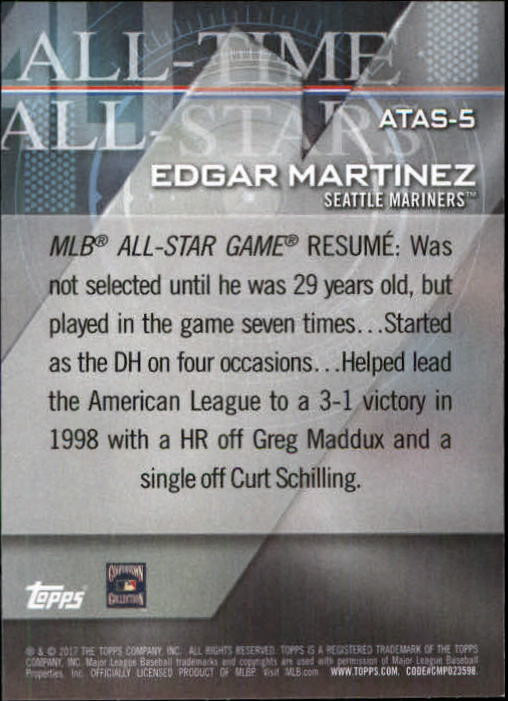 This Edgar Martinez 2017 Topps All Time All Stars card is a must-have for Mariners fans and collectors! The crisp design highlights his legendary career, and the near mint condition makes it a great addition to any collection. A fantastic insert from a top-tier set—highly recommended for baseball memorabilia enthusiasts!