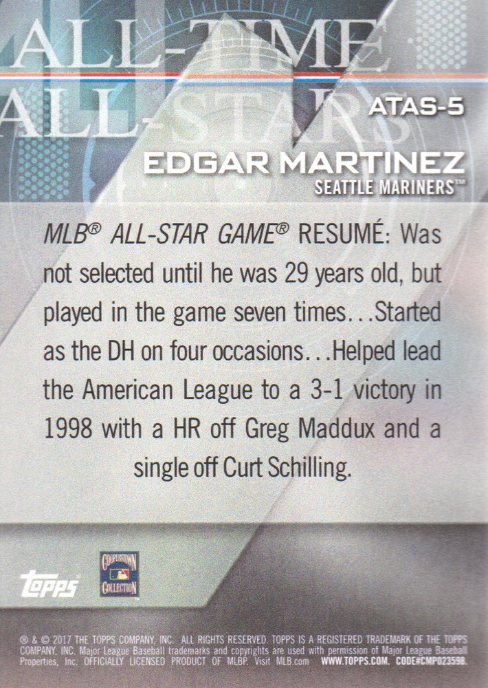 *** PLEASE READ *** Our Shipping Policy - Single Cards Only USA Orders (Including Hawaii, Alaska, Puerto Rico & all US Territories) Pay one FLAT SHIPPING FEE regardless of how many single cards you buy. We offer combined shipping when you buy multiple items. Please add the items you wish to purchase to eBay's shopping cart to get our combined shipping offer & qualify for one of our promotions. All qualifying promotions & offers are automatically applied during checkout by eBay. We cannot combine multiple orders once payment is completed. Please be sure to read our promotions & offers carefully to qualify. International Orders (Including Canada, Europe, Asia & Australia) Pay one FLAT SHIPPING FEE regardless of how many single cards you buy. We offer combined shipping when you buy multiple items . Please add the items you wish to purchase to eBay's shopping cart to get our combined shipping offer & qualify for one of our promotions. We cannot combine multiple orders once payment is completed. We reserve the right to refuse shipments to certain countries. Please contact us if you have any questions or concerns. Payment Information & Terms of Sale We accept PayPal & all major credit cards offered through eBay checkout. Orders are shipped within 24 hours of payment, or the next business day if payment is made on Saturday, Sunday or a Holiday. We ship Worldwide! 2017 Topps Baseball All-Time All-Stars #ATAS-5 Edgar Martinez Front Back Sport: Baseball Set: 2017 Topps All Time All Stars Year: 2017 Item#: ATAS5 Player: Edgar Martinez Team: Seattle Mariners Brand: Topps Manufacturer: Topps Co. Grading Company: Raw Grade SetType: Insert Item Condition: Near Mint/Mint 2014 Beckett Collectibles, LLC. All Rights Reserved Powered by: About Us We have been eBay Sellers since 1998. Our feedback is solid, so please purchase with confidence! We leave feedback on all transactions once payment has been completed. Please contact us if you experience any problems or issues with your order. <!--##BCILogoEnd##-->