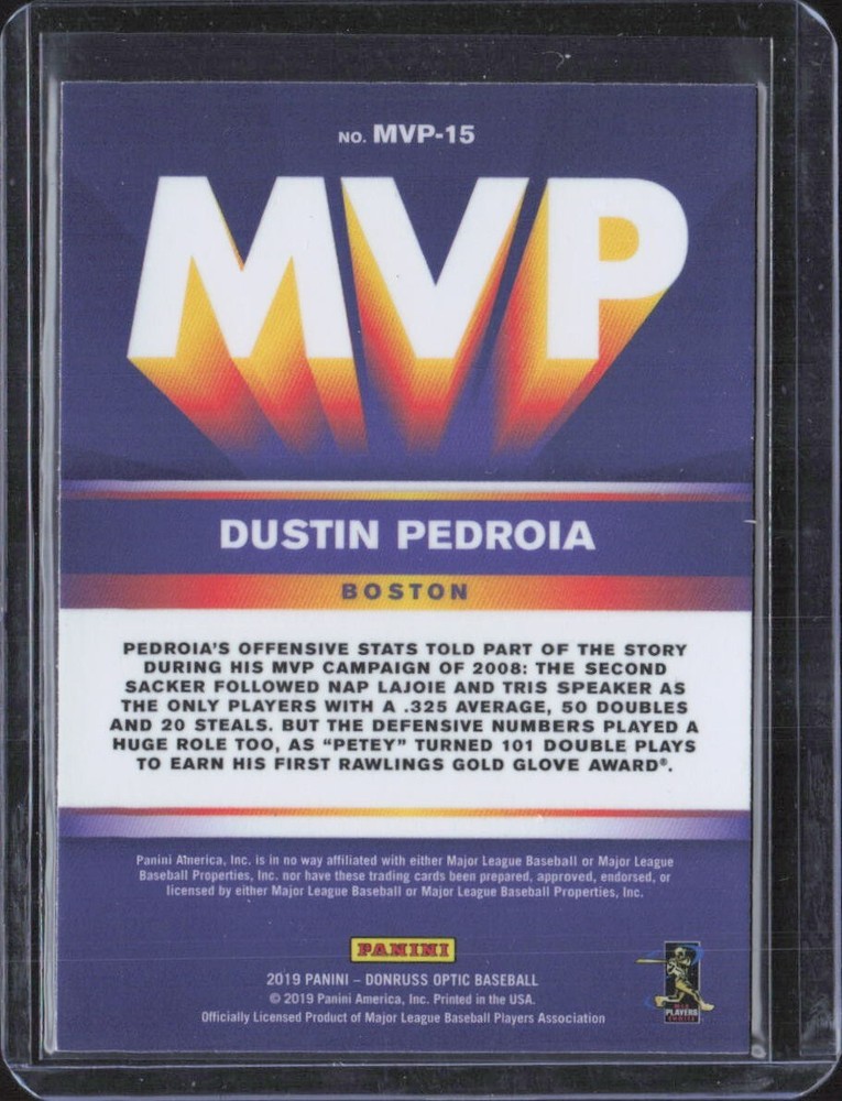This is a 2019 Donruss Optic trading card featuring Dustin Pedroia of the Boston Red Sox. The card is part of the MVP insert set, with card number MVP-15. It is manufactured by Panini and is a sports trading card focused on baseball. The card is not autographed and is in mint condition.