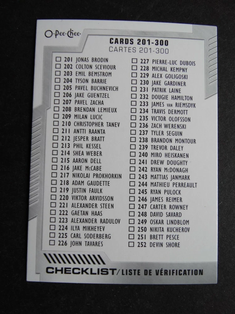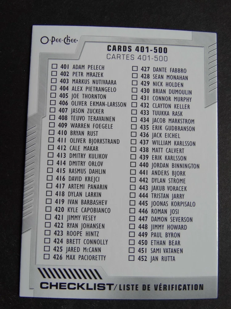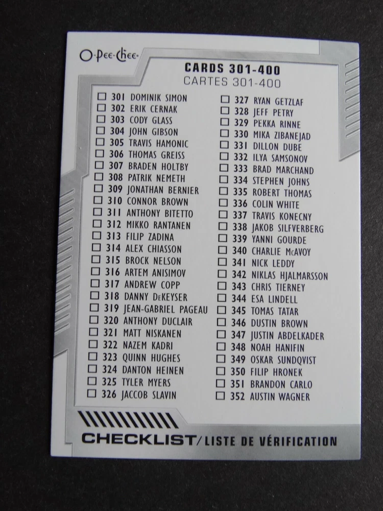 2020-21 UD O-Pee-Chee Hockey Cards Complete Your Set You U Pick From List 251-500 251 Brett Pesce - Carolina Hurricanes 252 Devin Shore - Columbus Blue Jackets 253 Patrick Kane - Chicago Blackhawks 254 Craig Smith - Nashville Predators 255 Jake DeBrusk - Boston Bruins 256 Nikita Zaitsev - Ottawa Senators 257 Lars Eller - Washington Capitals 258 Christian Dvorak - Arizona Coyotes 259 Laurent Brossoit - Winnipeg Jets 260 Kirby Dach - Chicago Blackhawks 261 Nick Jensen - Washington Capitals 262 Chris Kreider - New York Rangers 263 Jaden Schwartz - St. Louis Blues 264 Mark Giordano - Calgary Flames 265 Tyler Bozak - St. Louis Blues 266 Filip Forsberg - Nashville Predators 267 Vladimir Tarasenko - St. Louis Blues 268 Tyler Bertuzzi - Detroit Red Wings 269 Taylor Hall - Arizona Coyotes 270 Nicolas Hague - Vegas Golden Knights 271 Devon Toews - New York Islanders 272 Reilly Smith - Vegas Golden Knights 273 Radim Simek - San Jose Sharks 274 T.J. Brodie - Calgary Flames 275 Andrew Shaw - Chicago Blackhawks 276 Robin Lehner - Vegas Golden Knights 277 Kaapo Kakko - New York Rangers 278 Ryan Dzingel - Carolina Hurricanes 279 Kasperi Kapanen - Toronto Maple Leafs 280 Kris Letang - Pittsburgh Penguins 281 Evgenii Dadonov - Florida Panthers 282 Patric Hornqvist - Pittsburgh Penguins 283 Elvis Merzlikins - Columbus Blue Jackets 284 Derek Stepan - Arizona Coyotes 285 Jeff Carter - Los Angeles Kings 286 Rocco Grimaldi - Nashville Predators 287 Adam Boqvist - Chicago Blackhawks 288 Anders Lee - New York Islanders 289 Sidney Crosby - Pittsburgh Penguins 290 Alec Martinez - Vegas Golden Knights 291 Jonathan Huberdeau - Florida Panthers 292 Jonathan Drouin - Montreal Canadiens 293 Thomas Chabot - Ottawa Senators 294 Kyle Palmieri - New Jersey Devils 295 Cody Eakin - Winnipeg Jets 296 Artturi Lehkonen - Montreal Canadiens 297 Adam Larsson - Edmonton Oilers 298 Noel Acciari - Florida Panthers 299 Richard Panik - Washington Capitals 300 Checklist Card 301 Dominik Simon - Pittsburgh Penguins 302 Erik Cernak - Tampa Bay Lightning 303 Cody Glass - Vegas Golden Knights 304 John Gibson - Anaheim Ducks 305 Travis Hamonic - Calgary Flames 306 Thomas Greiss - New York Islanders 307 Braden Holtby - Washington Capitals 308 Patrik Nemeth - Detroit Red Wings 309 Jonathan Bernier - Detroit Red Wings 310 Connor Brown - Ottawa Senators 311 Anthony Bitetto - Winnipeg Jets 312 Mikko Rantanen - Colorado Avalanche 313 Filip Zadina - Detroit Red Wings 314 Alex Chiasson - Edmonton Oilers 315 Brock Nelson - New York Islanders 316 Artem Anisimov - Ottawa Senators 317 Andrew Copp - Winnipeg Jets 318 Danny DeKeyser - Detroit Red Wings 319 Jean-Gabriel Pageau - New York Islanders 320 Anthony Duclair - Ottawa Senators 321 Matt Niskanen - Philadelphia Flyers 322 Nazem Kadri - Colorado Avalanche 323 Quinn Hughes - Vancouver Canucks 324 Danton Heinen - Anaheim Ducks 325 Tyler Myers - Vancouver Canucks 326 Jaccob Slavin - Carolina Hurricanes 327 Ryan Getzlaf - Anaheim Ducks 328 Jeff Petry - Montreal Canadiens 329 Pekka Rinne - Nashville Predators 330 Mika Zibanejad - New York Rangers 331 Dillon Dube - Calgary Flames 332 Ilya Samsonov - Washington Capitals 333 Brad Marchand - Boston Bruins 334 Stephen Johns - Dallas Stars 335 Robert Thomas - St. Louis Blues 336 Colin White - Ottawa Senators 337 Travis Konecny - Philadelphia Flyers 338 Jakob Silfverberg - Anaheim Ducks 339 Yanni Gourde - Tampa Bay Lightning 340 Charlie McAvoy - Boston Bruins 341 Nick Leddy - New York Islanders 342 Niklas Hjalmarsson - Arizona Coyotes 343 Chris Tierney - Ottawa Senators 344 Esa Lindell - Dallas Stars 345 Tomas Tatar - Montreal Canadiens 346 Dustin Brown - Los Angeles Kings 347 Justin Abdelkader - Detroit Red Wings 348 Noah Hanifin - Calgary Flames 349 Oskar Sundqvist - St. Louis Blues 350 Filip Hronek - Detroit Red Wings 351 Brandon Carlo - Boston Bruins 352 Austin Wagner - Los Angeles Kings 353 Frederik Andersen - Toronto Maple Leafs 354 Alexander Nylander - Chicago Blackhawks 355 Brandon Sutter - Vancouver Canucks 356 Mackenzie Blackwood - New Jersey Devils 357 Cam Atkinson - Columbus Blue Jackets 358 Robby Fabbri - Detroit Red Wings 359 Andreas Athanasiou - Edmonton Oilers 360 Zach Hyman - Toronto Maple Leafs 361 Nino Niederreiter - Carolina Hurricanes 362 Alex Kerfoot - Toronto Maple Leafs 363 Paul Stastny - Vegas Golden Knights 364 Jake Virtanen - Vancouver Canucks 365 Ron Hainsey - Ottawa Senators 366 Erik Gustafsson - Calgary Flames 367 Hampus Lindholm - Anaheim Ducks 368 Drake Caggiula - Chicago Blackhawks 369 Tyler Johnson - Tampa Bay Lightning 370 David Perron - St. Louis Blues 371 Jonathan Marchessault - Vegas Golden Knights 372 Linus Ullmark - Buffalo Sabres 373 Derick Brassard - New York Islanders 374 Brent Burns - San Jose Sharks 375 Adam Henrique - Anaheim Ducks 376 Zdeno Chara - Boston Bruins 377 Martin Necas - Carolina Hurricanes 378 Alexander Edler - Vancouver Canucks 379 Alex Stalock - Minnesota Wild 380 Kailer Yamamoto - Edmonton Oilers 381 Patrick Maroon - Tampa Bay Lightning 382 Alex Ovechkin - Washington Capitals 383 Cal Clutterbuck - New York Islanders 384 Mark Scheifele - Winnipeg Jets 385 Erik Johnson - Colorado Avalanche 386 John Marino - Pittsburgh Penguins 387 Carl Hagelin - Washington Capitals 388 Brandon Saad - Chicago Blackhawks 389 Anthony Beauvillier - New York Islanders 390 Mathew Barzal - New York Islanders 391 Karson Kuhlman - Boston Bruins 392 Logan Couture - San Jose Sharks 393 Jack Roslovic - Winnipeg Jets 394 Brendan Smith - New York Rangers 395 Kyle Turris - Nashville Predators 396 Nick Suzuki - Montreal Canadiens 397 Carter Hart - Philadelphia Flyers 398 Patrick Marleau - Pittsburgh Penguins 399 Rasmus Ristolainen - Buffalo Sabres 400 Checklist Card 401 Adam Pelech - New York Islanders 402 Petr Mrazek - Carolina Hurricanes 403 Markus Nutivaara - Columbus Blue Jackets 404 Alex Pietrangelo - St. Louis Blues 405 Joe Thornton - San Jose Sharks 406 Oliver Ekman-Larsson - Arizona Coyotes 407 Jason Zucker - Pittsburgh Penguins
