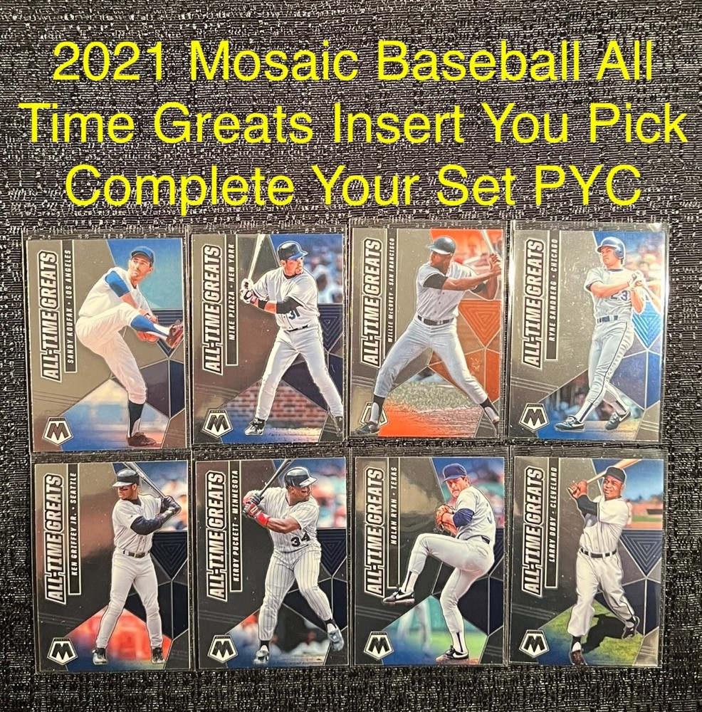 View My other Variation Listings In My Store Add The Cards You Want To Your Cart & Check Out To Receive The Discount 2021 Mosaic Baseball ALL TIME GREATS Insert You Pick Card Complete Your Set PYC Condition: Like New (see photos) All cards will come in a protective sleeve. & Card Saver! Please take a look at my other sports items for sale. Follow Me on Instagram - Thepsa10cards Subscribe On YouTube - Psa10cards