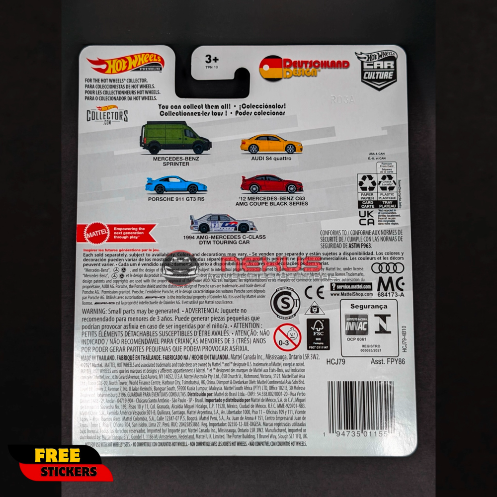 Experience German Performance with this Mercedes-Benz C63 AMG Black Series! Condition: Brand new, mint on card. Features: 1:64 Scale: Perfect size for your collection or display. Car Culture: Deutschland Design Series: From Hot Wheels, featuring premium diecast vehicles celebrating German automotive excellence. 2012 Mercedes-Benz C63 AMG Coupe Black Series: This diecast captures the aggressive styling and high-performance capabilities of this rare and powerful Mercedes. Black Finish: A menacing and fitting color for this track-focused machine. Real Riders Wheels: Premium wheels with real rubber tires for an extra touch of realism. Freebies: Free random vehicle sticker! Why You Need This: Rare and Powerful: The C63 AMG Black Series is a highly sought-after performance car, and this diecast is a great way to own a piece of that exclusivity. German Engineering: This diecast embodies the precision and performance that German automakers are known for. Premium Quality: The Car Culture series offers enhanced details and features, including Real Riders wheels. Mint Condition: Guaranteed to arrive in pristine shape, ready for display. Add this Mercedes-Benz C63 AMG Black Series to your collection today! Important Notes: Combined shipping available. All sales are final. No returns or refunds. Item will be carefully packed to ensure it arrives in pristine condition.