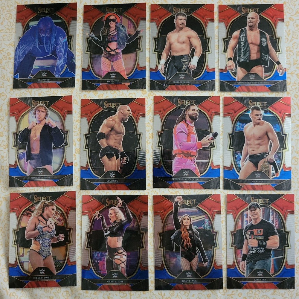 2023 Panini WWE Select Retail Red White Blue Concourse YOU PICK Complete Your Set. I will combine shipping to reduce cost but please wait for an invoice total or message when you are ready to complete your order. Get ready to add some amazing WWE trading cards to your collection with this complete set by Panini. This set features some of the most iconic wrestlers like Goldberg, Eddie Guerrero, Becky Lynch, Bray Wyatt, Seth Rollins, and Stone Cold Steve Austin. Each card has a unique red, white, and blue design that makes it stand out from the rest. The cards are in excellent condition and will make a great addition to any fan's collection. The 2023 Panini WWE Select Retail Red White Blue Set is a must-have for all wrestling fans out there. This set includes cards from the 2023 season featuring some of the biggest names in the industry. With these cards, you can relive some of the most legendary moments in WWE history. So, don't wait any longer, get your hands on this incredible set and complete your collection today!