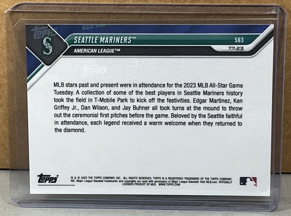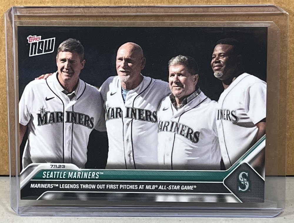 2023 TOPPS NOW #593 DAN WILSON / JAY BUHNER / EDGAR MARTINEZ / KEN GRIFFEY JR. SEATTLE MARINERS legends throw out first pitches at MLB All-Star Game. Print run of 940. Worldwide shipping available. U.S. - Winning bidder to add $3.99 for careful USPS first class shipping with delivery confirmation. Add .50 for each additional item. All other countries - ship costs are calculated by eBay through international shipping program. Please message if interested in multiple items. Bid with confidence, 49000+ feedback. Thanks and check out my auctions ending every Sunday. Please note that combined ship rates are for items paid for on one invoice, thanks!