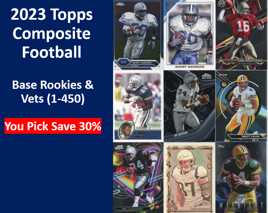 2023 Topps Composite Football Base Singles You Pick Choose Complete Your Set (1-450) updated 12/8/2024 Topps Chrome, Resurgence, Topps Chrome Black, Finest, Cosmic Chrome, Midnight, Heritage, Gallery, Allen & Ginter, 2003 Retro Buy 5+ Get 30% Off - simply use the add to cart button and the coupon code at the top of the listing. You can mix and match with other listings on my store. Click here to see all of my listings on my eBay Store Fast Shipping - will ship same day as payment is received Will ship well protected in penny sleeve and top loader, all inside team bag.