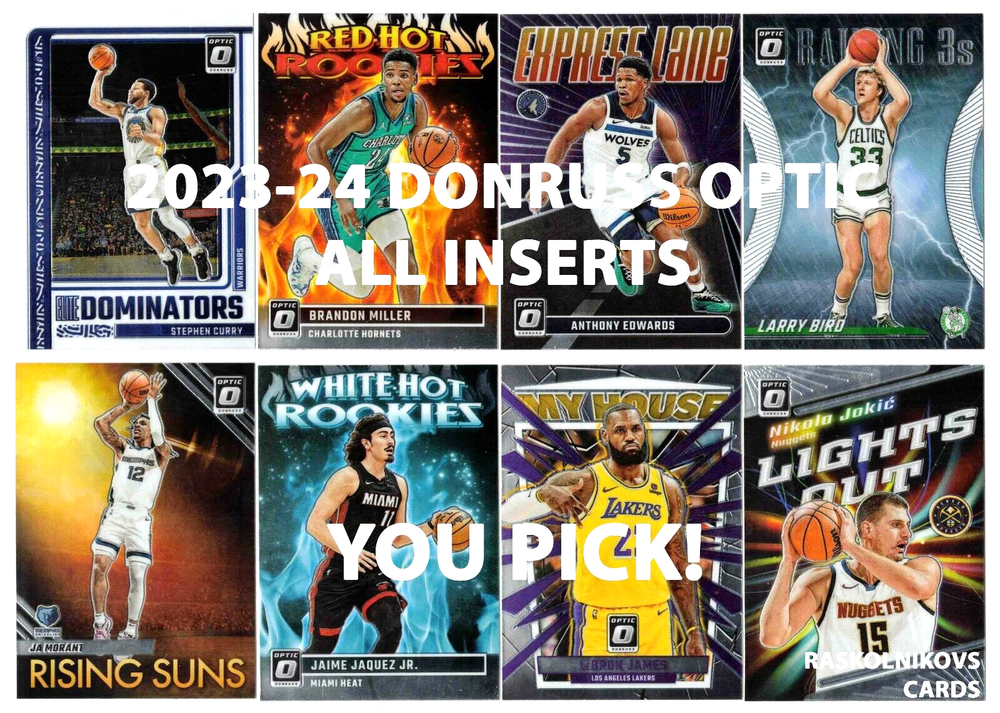 2023-2024 DONRUSS OPTIC NBA - Pick Your Insert Singles! DOMINATORS + EXPRESS LANE + LIGHTS OUT + MY HOUSE + OPTICAL ILLUSIONS + RAINING 3S + RED HOT ROOKIES + RISING SUNS + WINNER STAYS INSERT CARDS KINDLY NOTE I HAVE A TWO CARD OR $2.00 MINIMUM PURCHASE REQUIREMENT! Due To eBay Fees And Ever Increasing USPS Rates I Actually Lose Money On Single Card or $0.99 Sales. So That I Am Able To Continue Offering My Buyers The Best Prices AND Free Shipping, Any Orders That Do Not Meet The Two Card Or $2.00 Minimum Threshold Will Be Cancelled. All Cards Go From Pack To Sleeve. All Raw Cards Mint/Near Mint Unless Otherwise Indicated And Stored In Plastic Sleeves; Any Glare Or Marks Visible Are From Scanner Unless Otherwise Indicated. Payment Must Be Received Within 3 Days Of Sale. Kindly Refrain From Purchase If You Cannot Meet That Obligation. ONE SHIPPING PRICE FOR ANY AMOUNT OF CARDS IN ENTIRE STORE! : USA: FREE USPS 1 st Class Mail / CANADA: $1.99 / ALL OTHER REGIONS: $2.99 PLEASE SEE MY OTHER LISTINGS FOR MORE GREAT CARDS!
