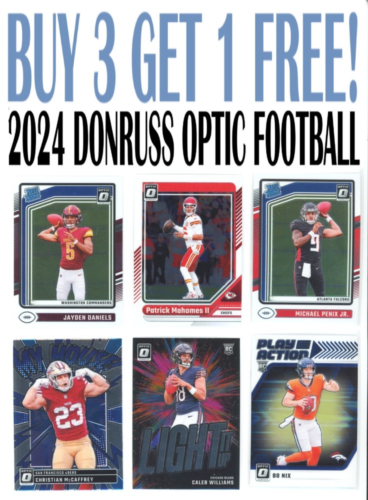 This is a "You Pick/Choose" listing for 2024 Donruss Optic Football (BASE 1-200). Click link below for Rated Rookies (201-300) and Inserts. All cards are pack fresh and immediately sleeved for protection. Please view pictures and ask ANY questions you may have before buying. Thank you! BUY WITH CONFIDENCE - TRUSTED SELLER SINCE 2004! ***Make Sure to add 4 or more cards to your cart BEFORE checking out in order to take advantage of the BUY 3 GET 1 FREE deal*** CLICK LINK BELOW FOR RATED ROOKIES (201-300) AND INSERTS 2024 Donruss Optic Football RATED ROOKIES & INSERTS (BUY 3 GET 1 FREE) You Pick | eBay CLICK LINK BELOW FOR PARALLELS 2024 Donruss Optic Football PARALLELS (BUY 3 GET 1 FREE) You Pick/Choose | eBay
