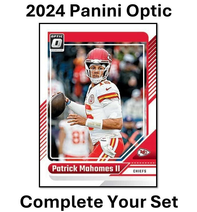 2024 Panini Optic Complete Your Set Singles Listing Year: 2024 Set: Panini Optic Sport: NFL Football Card Numbers: #1 - #300 Complete your sets! Click on the drop-down menu (Card #/player button) to pick your missing cards and use the "Add to Cart" feature to combine shipping on multiple items. All cards are in Near Mint or Better shape, pulled from a pack and put into storage for sale as singles. Shipping is only $0.99 on the first card and then $.15 per additional card in this listing. All items ship within 24 hours of payment being received from our Kansas City, KS Warehouse.