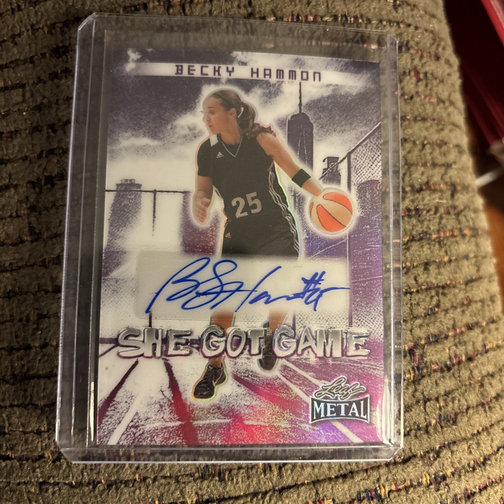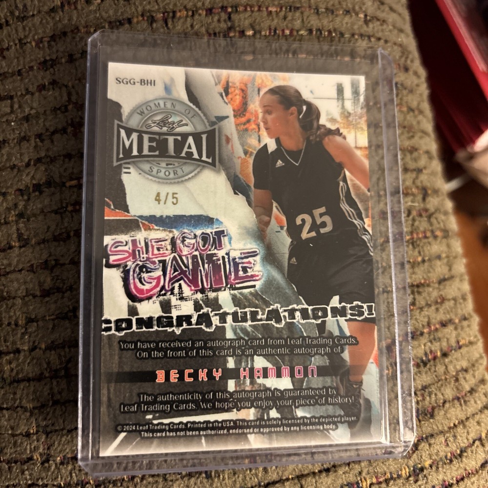 This 2024 Leaf Metal trading card features Becky Hammon 4/5. The card is part of the Women of Sport set and parallel/variety. It is a must-have for any sports trading card enthusiast who is looking to add a valuable addition to their collection. I will combine shipping on multiple lot purchases.