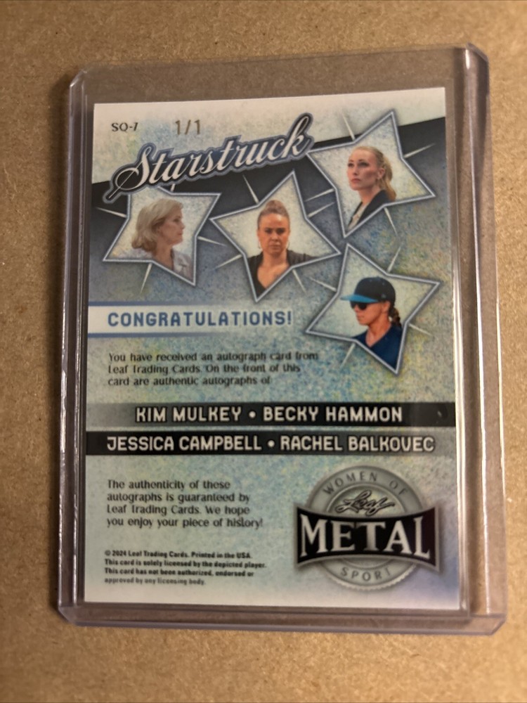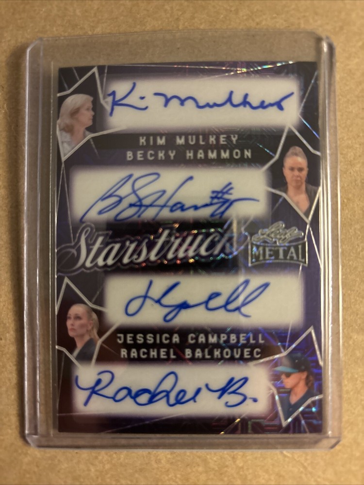 This 2024 Leaf Metal trading card features Kim Mulkey Becky Hammon Jessica Campbell Rachel Balkovec quad auto 1/1. The card is part of the Women of Sport set and parallel/variety. It is a must-have for any sports trading card enthusiast who is looking to add a valuable addition to their collection. The card is from the 2024 season and is sure to spark conversation about the athlete's performance. Don't miss out on the chance to own this unique and rare card.