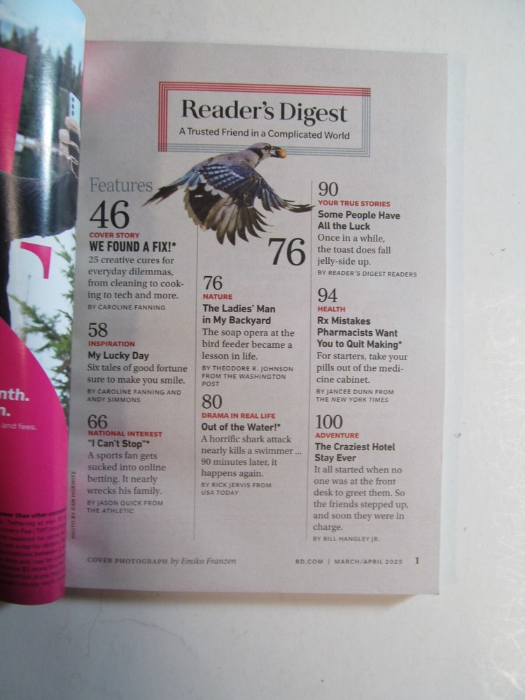 I subscribe to these magazines, have read the, and am offering them to you for your reading enjoyment. Please use the eBay photos to examine the covers and contents pages. 1. Reader's Digest. March/April 2025. 2. Better Homes & Gardens. March 2025. 3. Better Homes & Gardens. January/February 2025. 4. Magnolia. Spring 2025. 5. Good Housekeeping. March/April 2025. 6. Country Living. April/May 2025. 7. Travel + Leisure. March 2025. 8. Travel + Leisure. February 2025. Thank you!