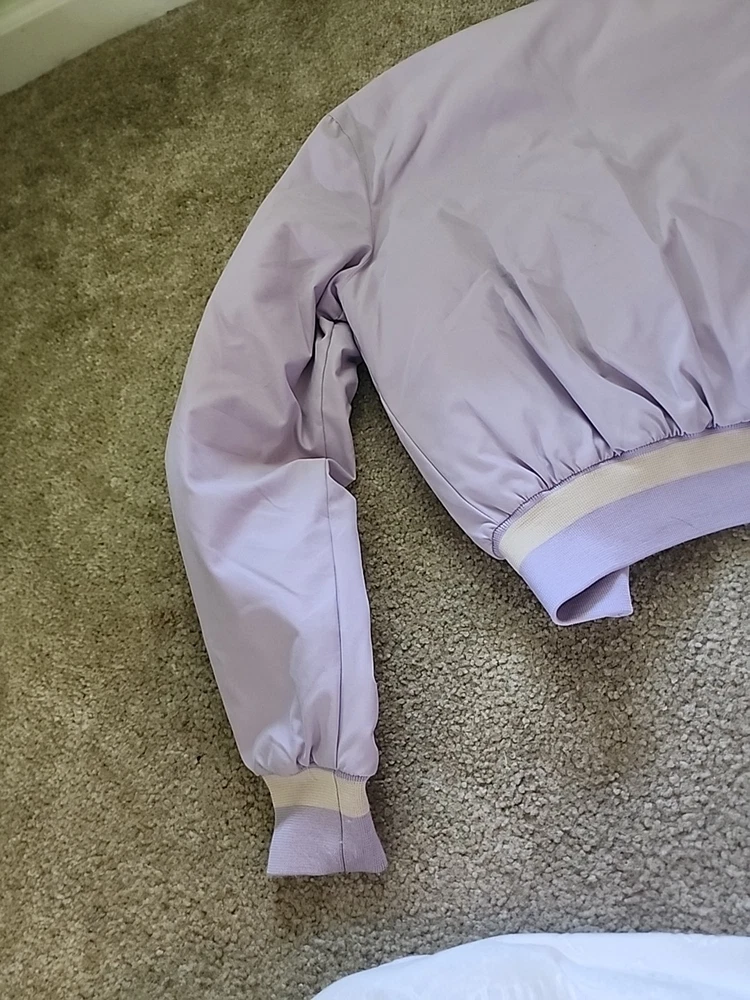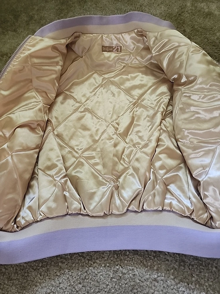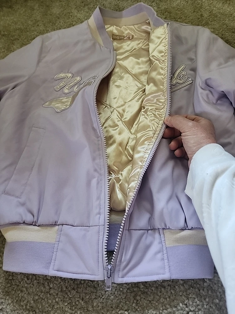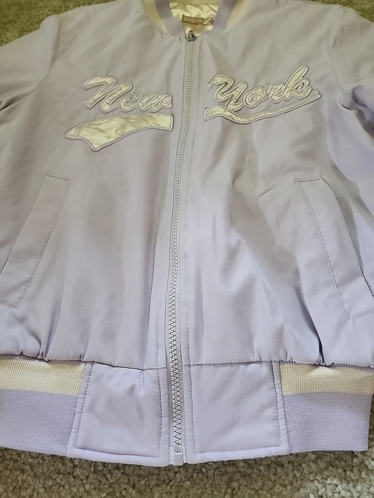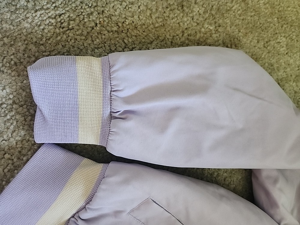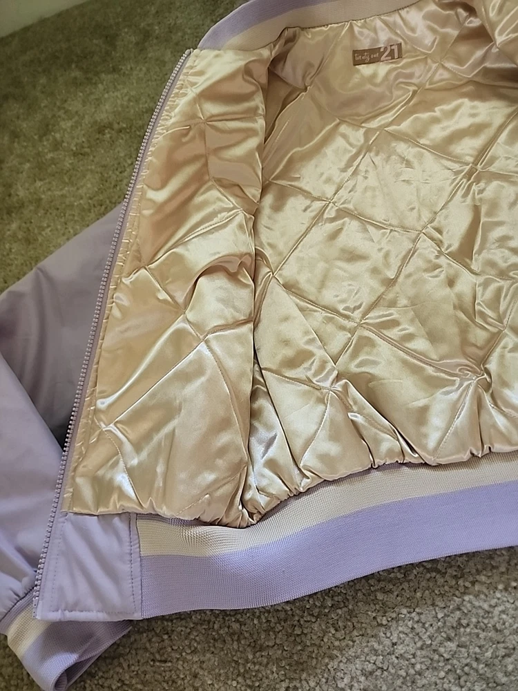 The 21 New York Lavender Jacket Vintage is a stylish and versatile outerwear piece perfect for various occasions such as travel, casual outings, and workwear. Made from a mix of polyester, cotton, satin, and nylon, this jacket features a zip closure, lined interior, and a range of features like elastic waist, pockets, and wind resistance. With its vintage design and purple color, this jacket is a great addition to any wardrobe, suitable for all seasons and available in a size small. Perfect for those looking for a classic and timeless jacket with a hint of 80s and 90s style.(SIZE IS BEING GUESSED AT COULDNT FIND
