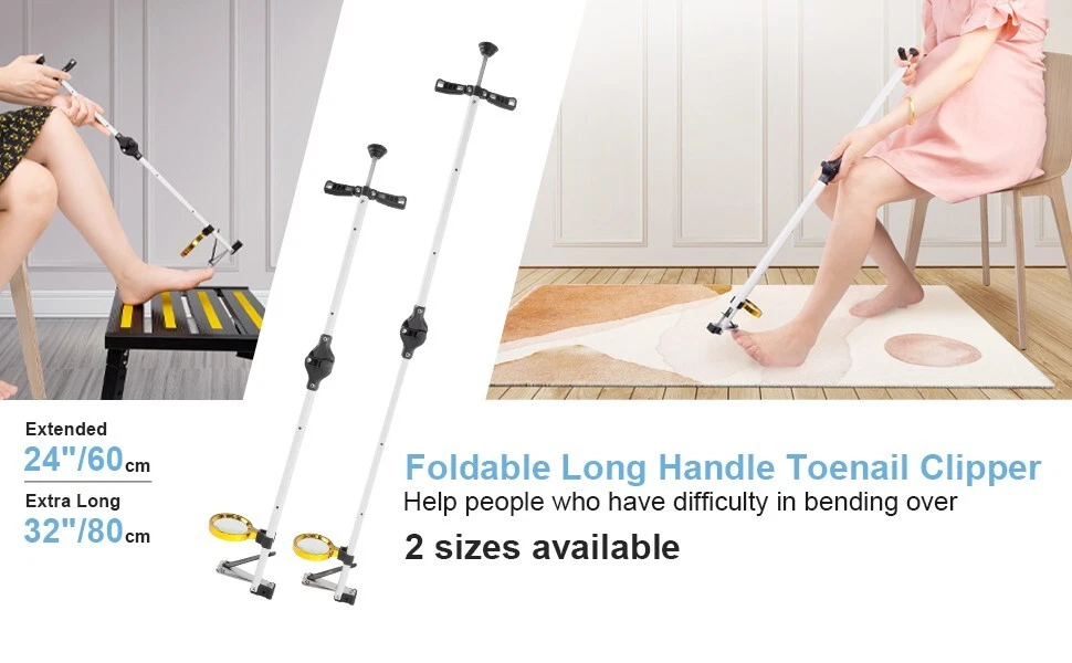 1. Foldable One-Piece Long Handle Nail Clipper: The foldable design is assembled without tools, which is more convenient to use. Easy to store and travel. 2. Adjustable Magnifier :Zoom in on the foot when using long-handled toenail clippers to help you target your toenails more easily and quickly. 3.Powerful and Beautiful: Long handle wide opening hair clipper with full aluminum shaft and high quality steel. Lightweight and easy to use. Remains great and sturdy with continued use. 4. 2sizes to choose :A variety of sizes for you to choose: Extended- 24" / 60cm, Extra Long- 32" / 80cm.Please refer to your height for selection. You can view the details page for all sizes. 5.Trim your toenails independently:Whether recovering from knee or hip surgery, suffering from arthritis or mobility, or limited range of motion due to overweight,CANALHOUT long-handled nail clippers allows you greater independence when trimming your toenails. Perfect for those who have trouble bending over, twisting or reaching out to trim their toenails. 6.No more uncomfortable bending or stretching;Better ergonomics:Our unique extended handle design allows the clipper to reach your toenails. Saving you from bending and Reaching.So you can avoid long-term painful distortions and try to reach out to cut your nails! The long-handled nail clippers can help you take care of your grooming to say providing you with more independent trimming of your toenails. 7.The exclusive design of the lid provides a more confident clip:It is reinforced with stainless steel ribs to provide greater leverage. The reinforced nail clippers with 4mm strong concave wide jaw have a stronger bite force, which means you can reduce your workload even with thick nails. (The width of standard nail clippers on the market is 2 mm) If bending down to clip your toenails is difficult or painful, CANALHOUT long handled clipper may be just the thing to make this task easier. I know easy things get hard in the world of getting old and disease. Getting started with long-handled toenail clippers may take a bit of learning and getting used to, so take your time. Our specially designed clippers are safe, light and high qualified.This product is specially designed for people who have difficulties in cutting their toenails. This clipper is 24 inches long. If for any reason your hands are unsteady or you can’t very clearly see your toenails, then PLEASE DO NOT BUY OR USE OUR CLIPPER ! Thank you for your understanding. Tips: For best results, soak nails before clipping to soften. 1.Soak your feet to soften the nails and cuticles.Dry them thoroughly before starting to clip. 2.Clip across the nail edge to the desired length.make sure to avoid accidentally nipping the skin. If for any reason your hands are unsteady or you can’t very clearly see your toenails, then PLEASE DO NOT BUY OR USE OUR CLIPPER ! Thank you for your understanding.