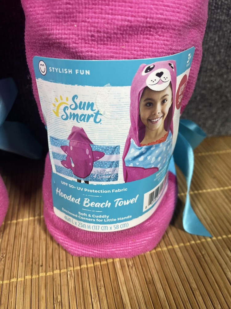 2 hooded beach towels, soft and cuddly, enclosed corners for little hands. UPF 50+ UV protection fabric....