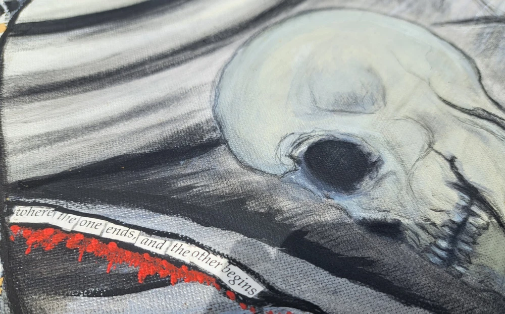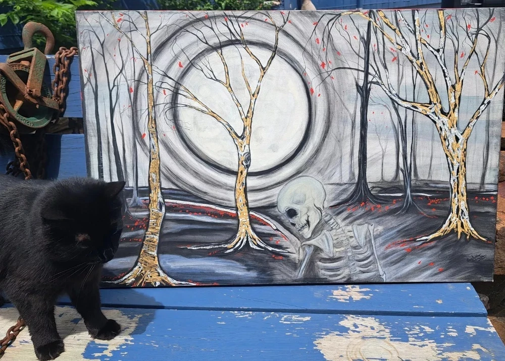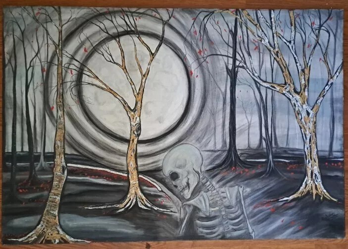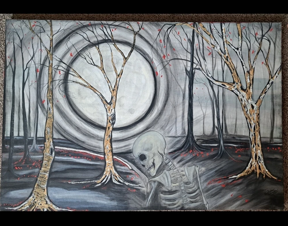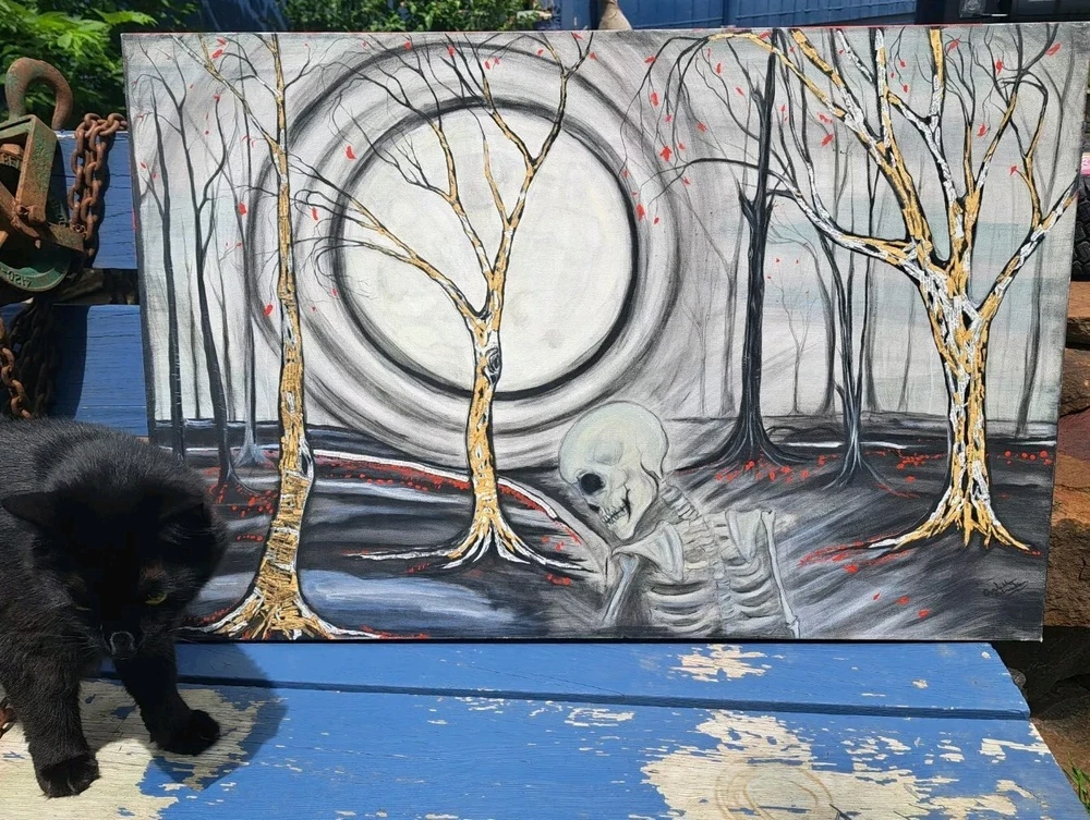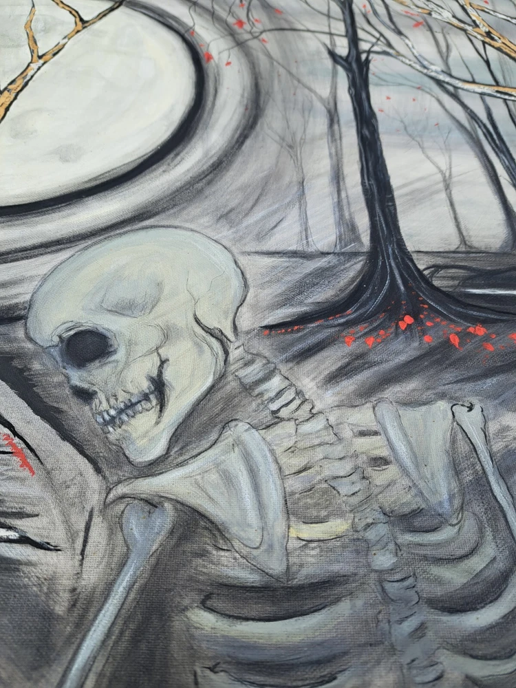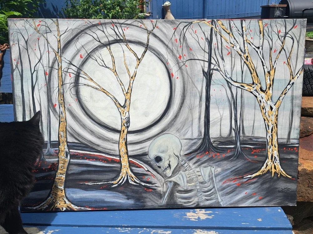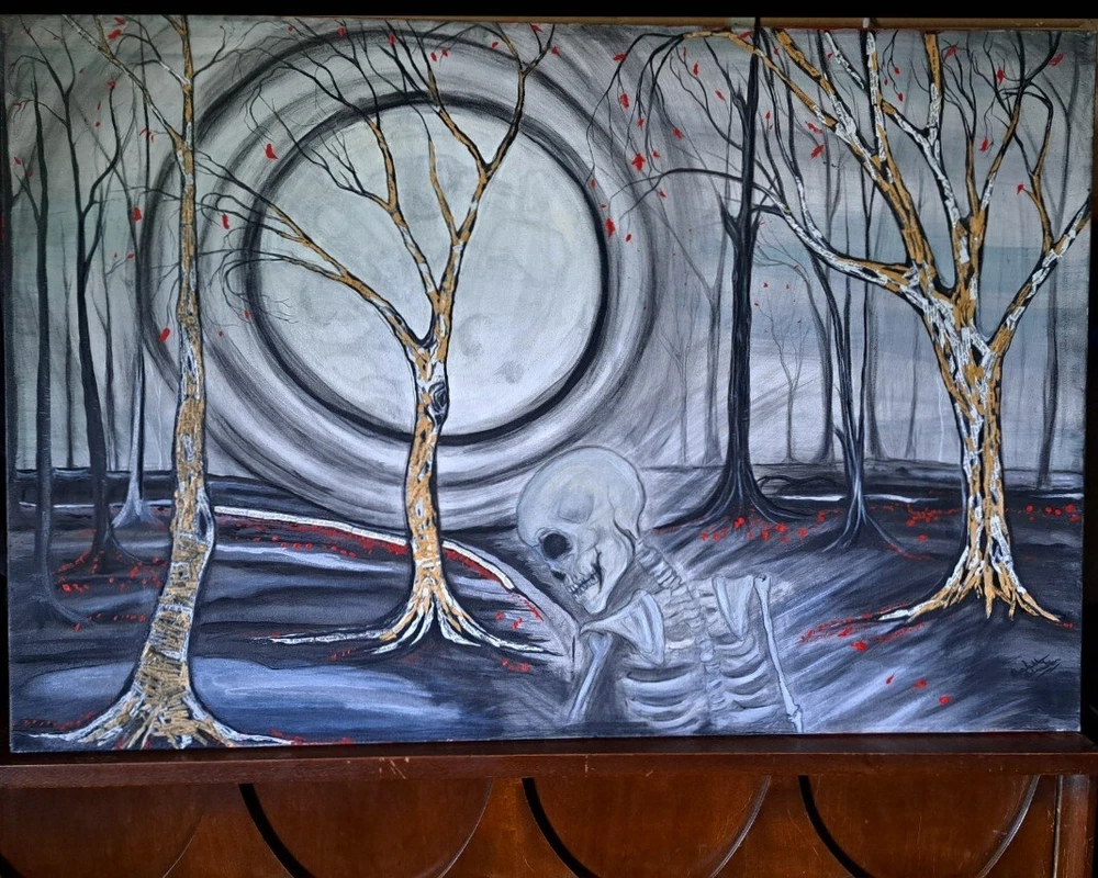 Large one of a kind unique 2ftx 3ft acrylic painting with decopaged lines from Edgar Allen Poe poem. Skull, Skelton , trees in a forest on canvas stretched over a wood frame.he tells a story full of memories. A great Christmas gift for that special friend or lo ed one who likes Poe, or dark art🧡