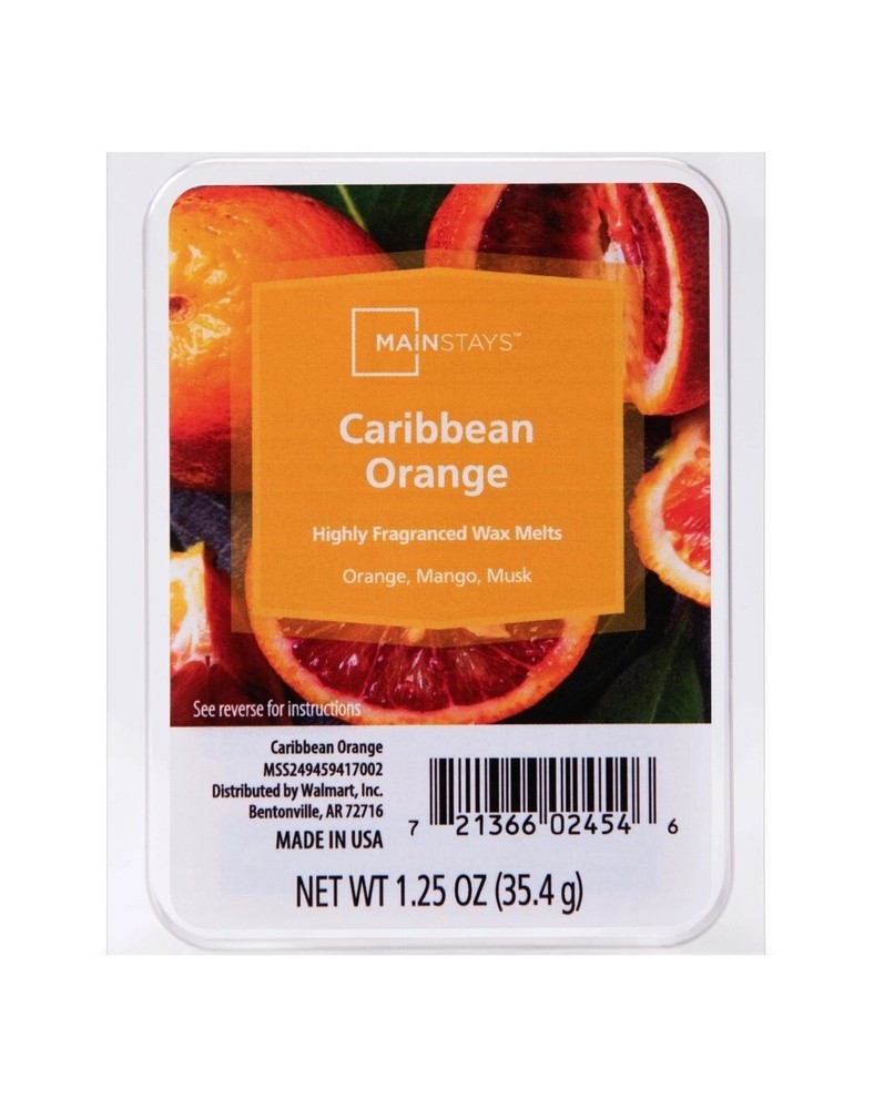 Lot of 2 packs Mainstays 1.25 oz Caribbean Orange 6-Cube Wax Melts Highly fragranced and will fill your home with pleasing scent when warmed. The Caribbean Orange fragrance offers a vibrant medley of effervescent blood orange splashed over tropical guava and succulent mango infused with tangy red currant, pink grapefruit essence, crisp lemon leaf, and enduring musk. These melts are ideal for use with Mainstays Electric Warmer. Simply break off one or two pieces of the melts and place in your favorite warmer. Wax melts allow you to fragrance your home without a flame and are easy to clean. Highly fragranced Wax melts allow you to quickly fill your home with a pleasant scent. Easy clean up. No flame or soot residue For use in your Mainstays Wax Warmer 1.25oz Caribbean Orange Wax Melt (2-pack)