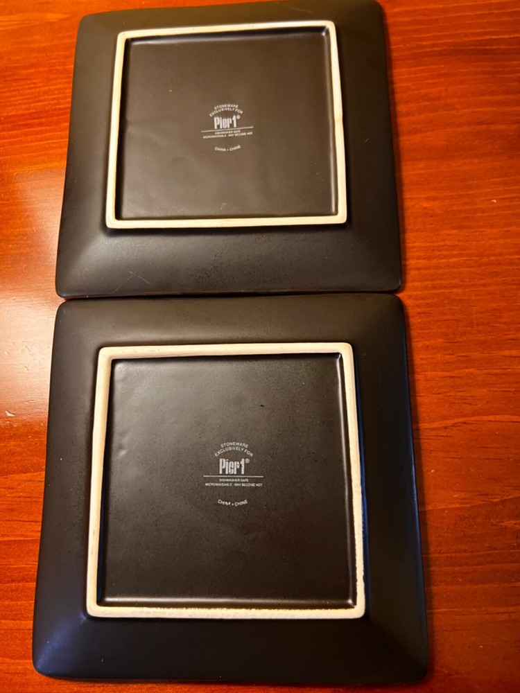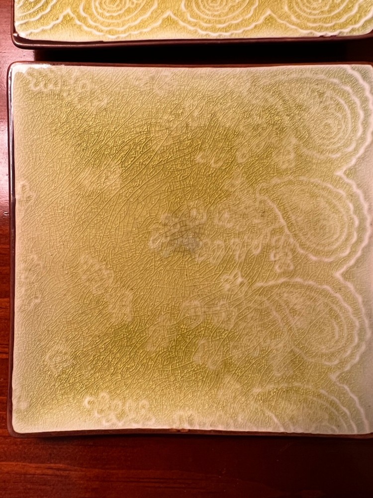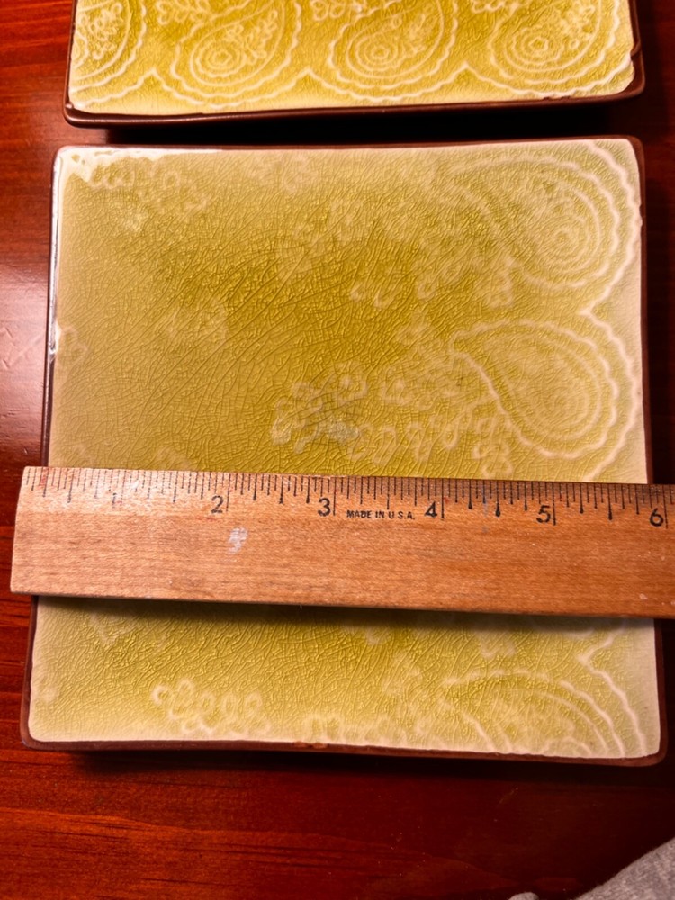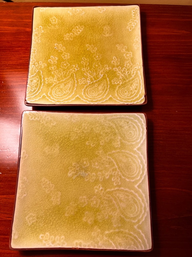 2x Pier1 Pier One Imports Green Appetizer Plates Square Dessert Plates Set 6”. Rare set paisley design. Set of two plates. They appear gently preowned. I see crazing on the plate, see all photos for details. No chips or cracks. From a smoke free environment. We should globally. No returns.