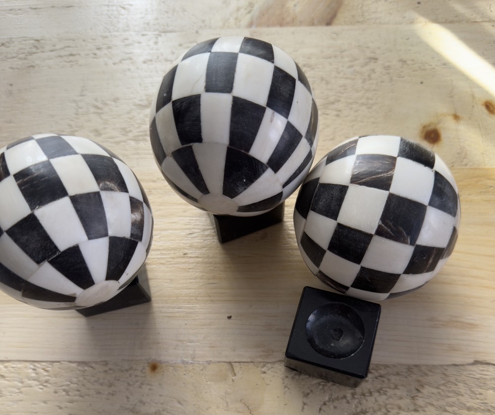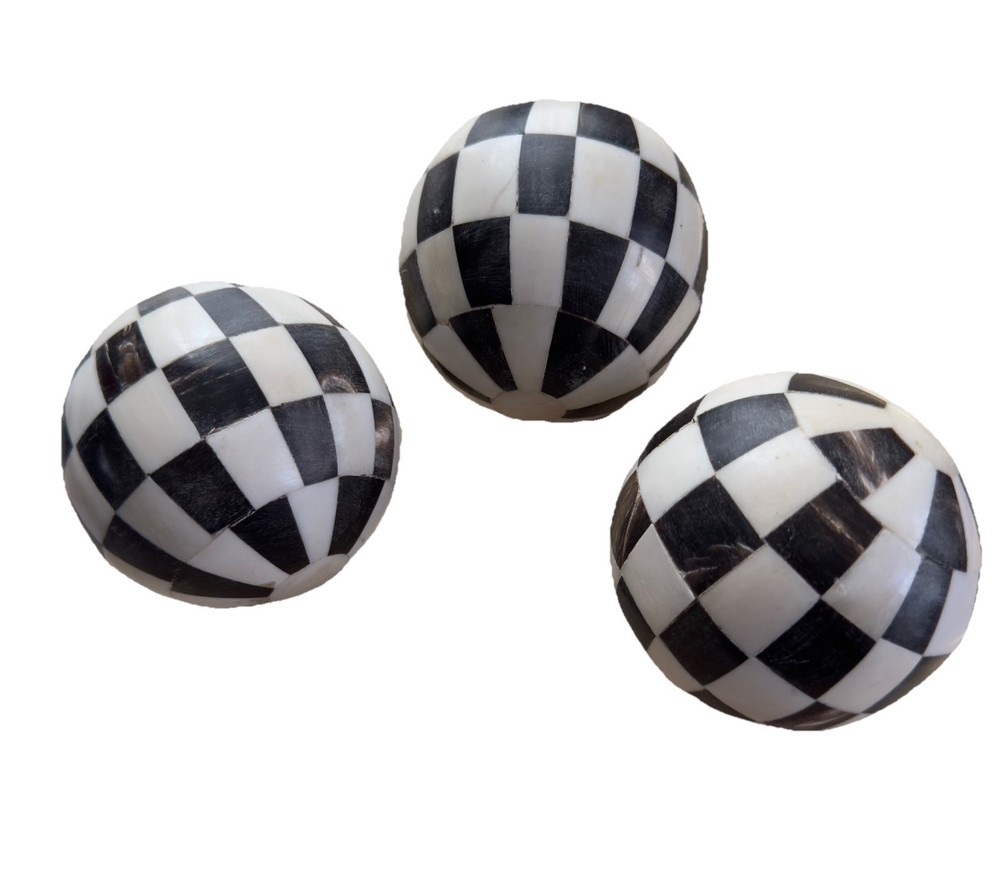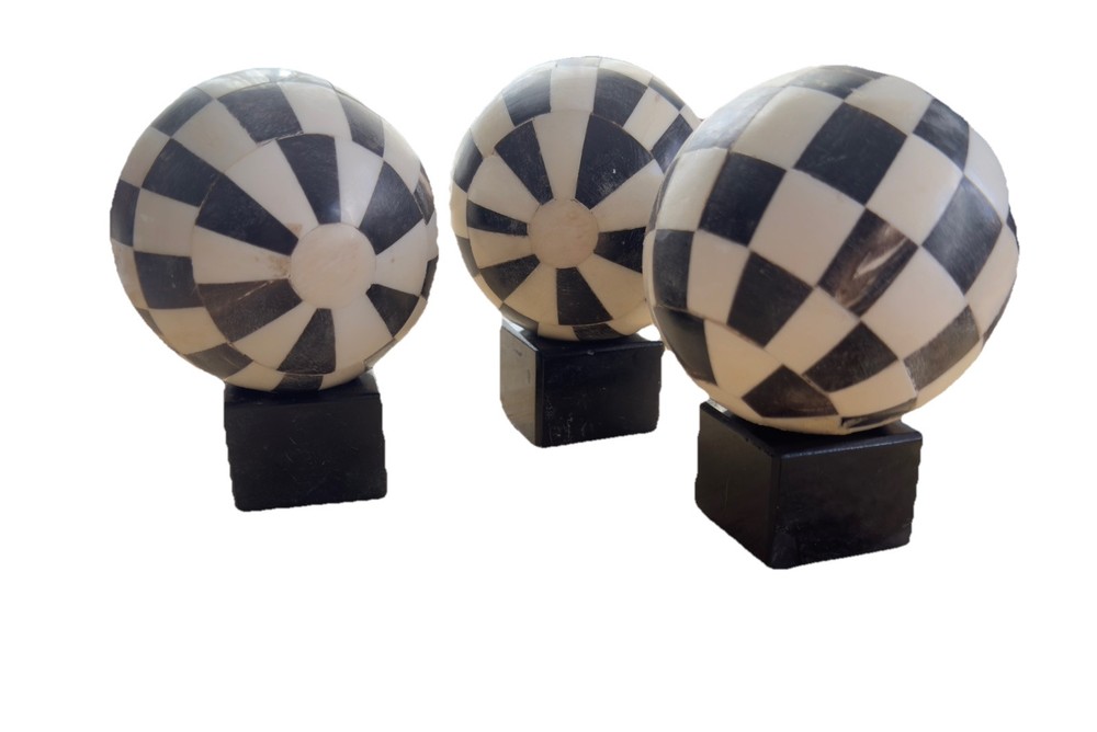 Being offered are three balls with stand for 125.00 Add a touch of sophistication and modernity to your living space with these 3 decorative balls from Indus Design Imports. The balls feature a unique checkered inlay design in black and white(Ivory) hues that will complement any decor style. Made from bone, these orbs are a perfect addition to your collection of decorative collectibles. Each ball stands at 3-4 inches tall and comes with a stand for easy display. The intricate inlayed features of these balls are a testament to the craftsmanship and artistry that went into their making. These original pieces are a must-have for collectors and enthusiasts alike.