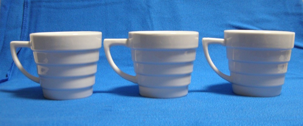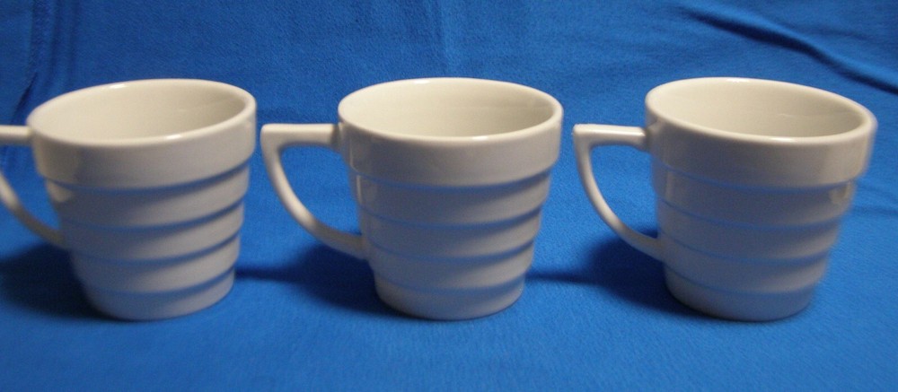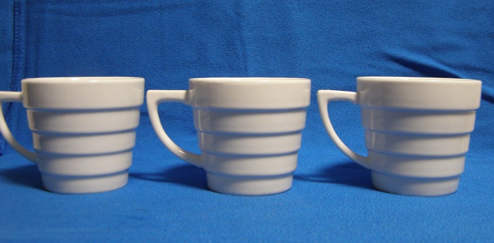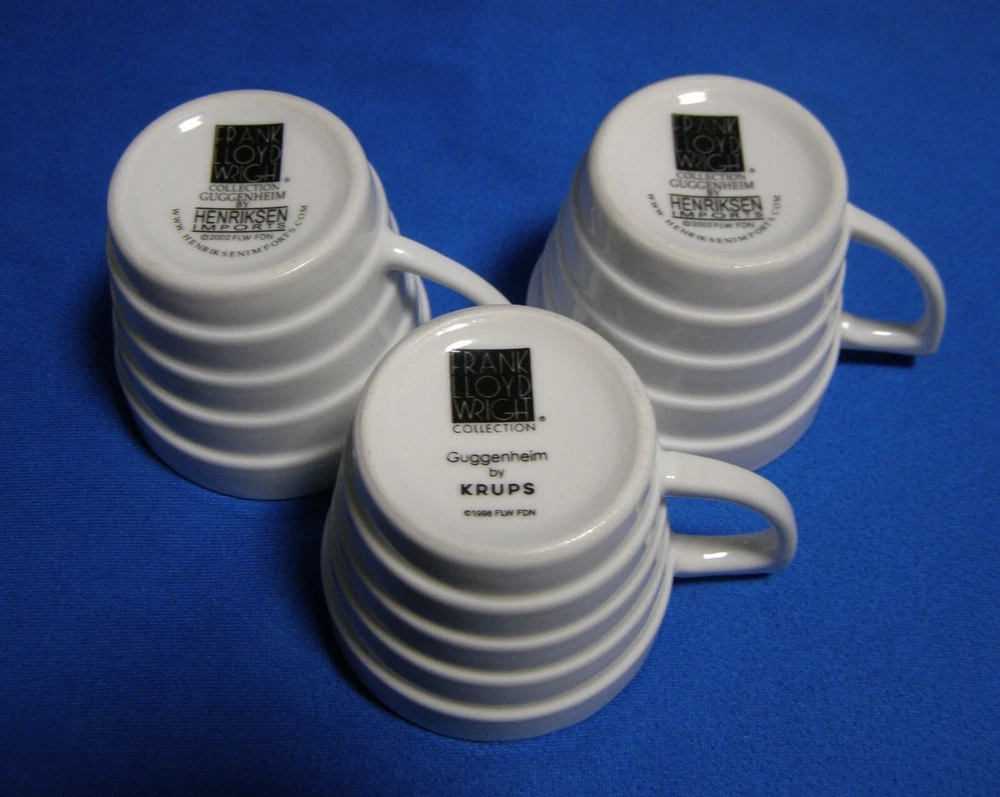 3 Frank Lloyd Wright Design Collection Guggenheim Coffee Cups. Flat Cup Not Mug. Stoneware, Henriksen Imports. 3 1/4" Diameter at Rim, 3" Tall. Excellent Pre-Owned Condition, No Flaws Noted, See Photo...