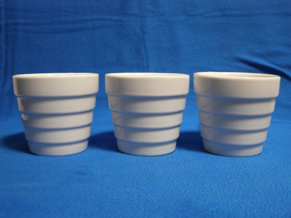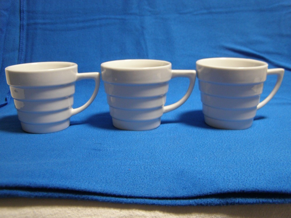 3 Frank Lloyd Wright Design Collection Guggenheim Coffee Cups. Flat Cup Not Mug. Stoneware, Henriksen Imports. 3 1/4" Diameter at Rim, 3" Tall. Excellent Pre-Owned Condition, No Flaws Noted, See Photos