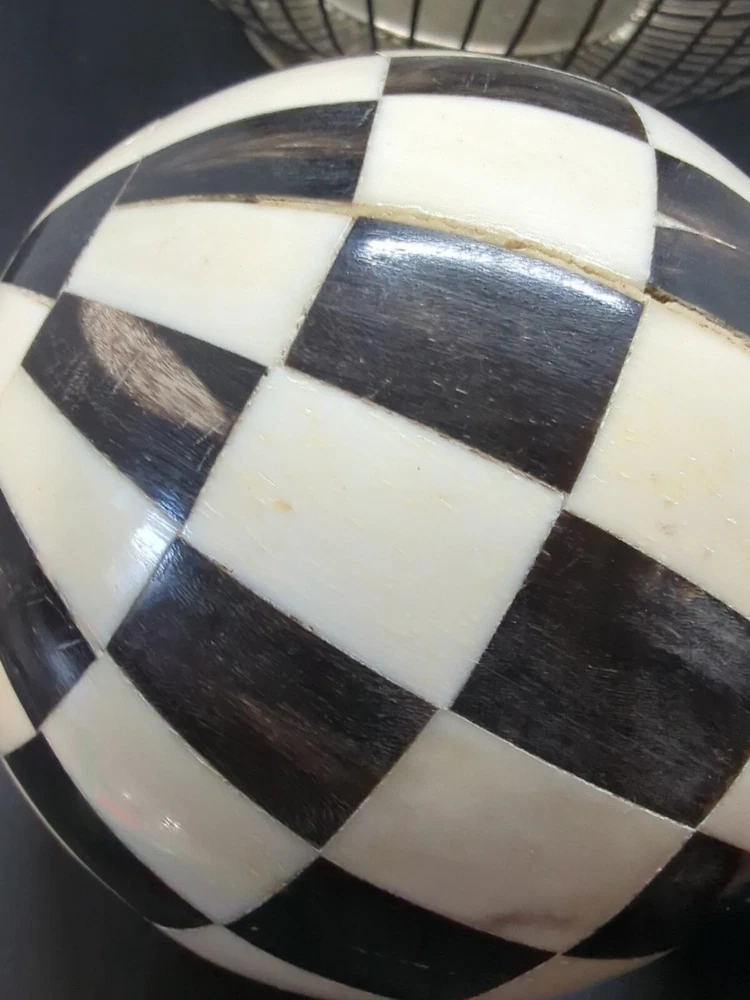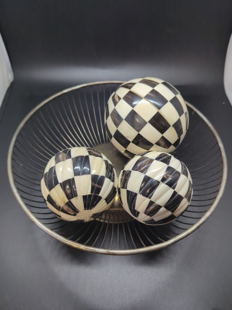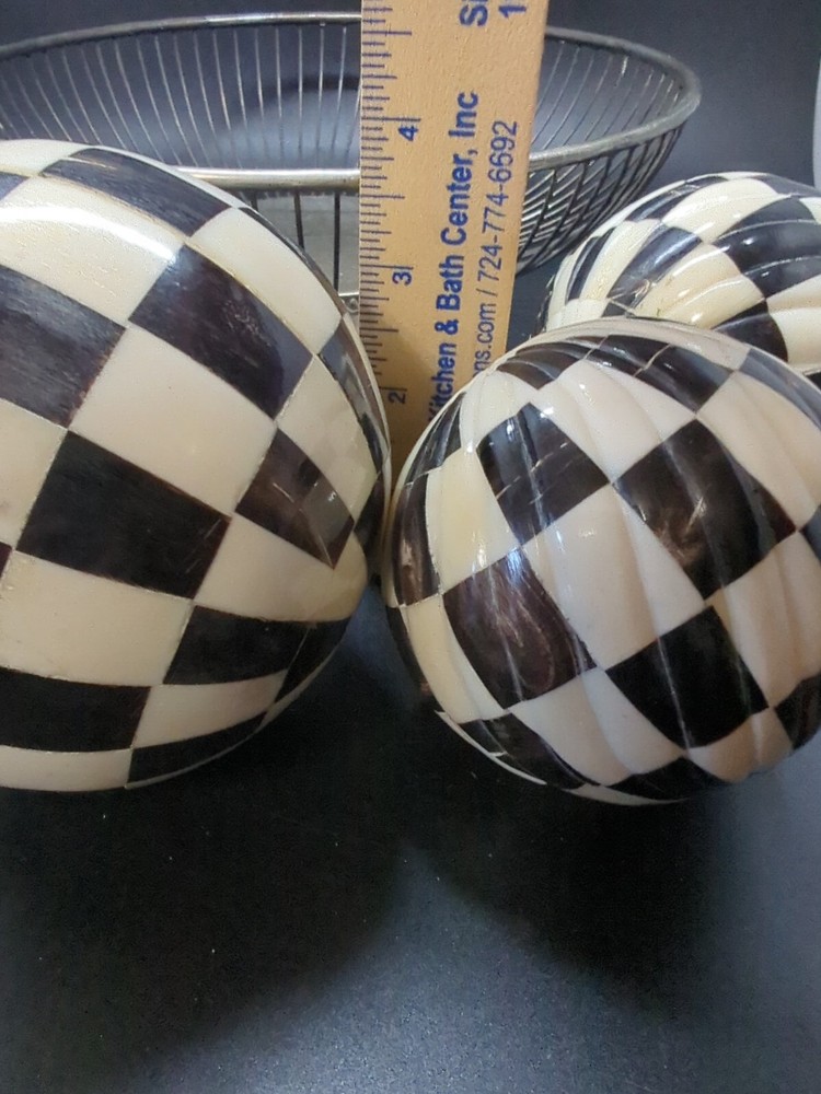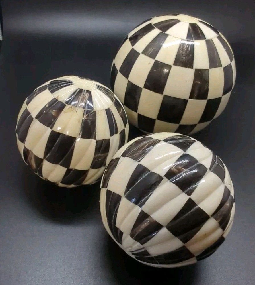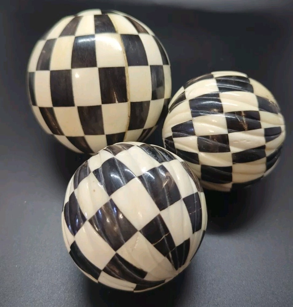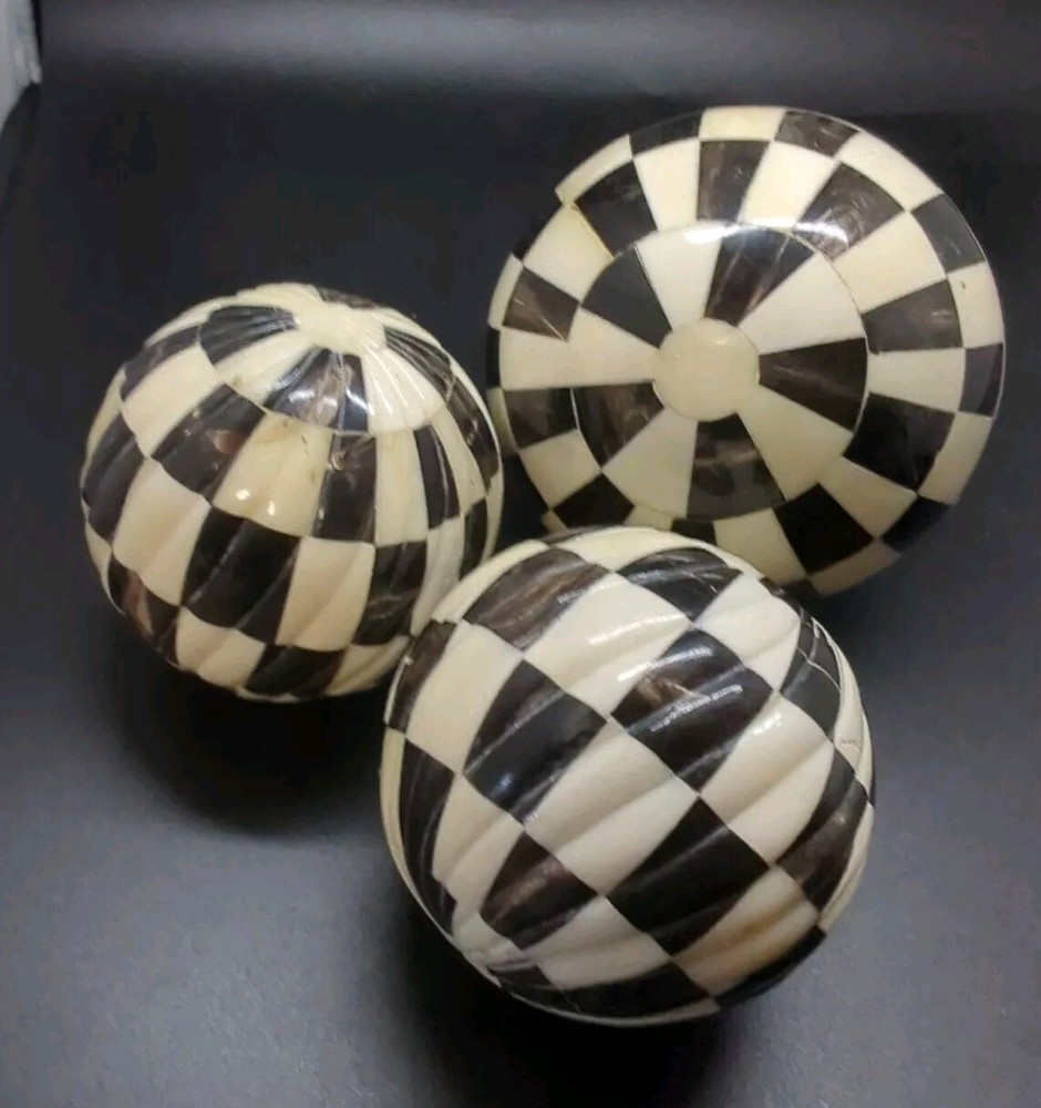 (3 ) - Indus Design Imports (Tempe, Az.) we- Checkered Inlay Black & White/ Ivory, Decorative/decor Balls 3-4" Orbs . Made of Natural, Hand- crafted organic bone Inlay (2) - 3", ( 1 )- 4" Mackenzie style. Modern, pop art, contemporary, country, folk. Please see attached photos for a better description 😊