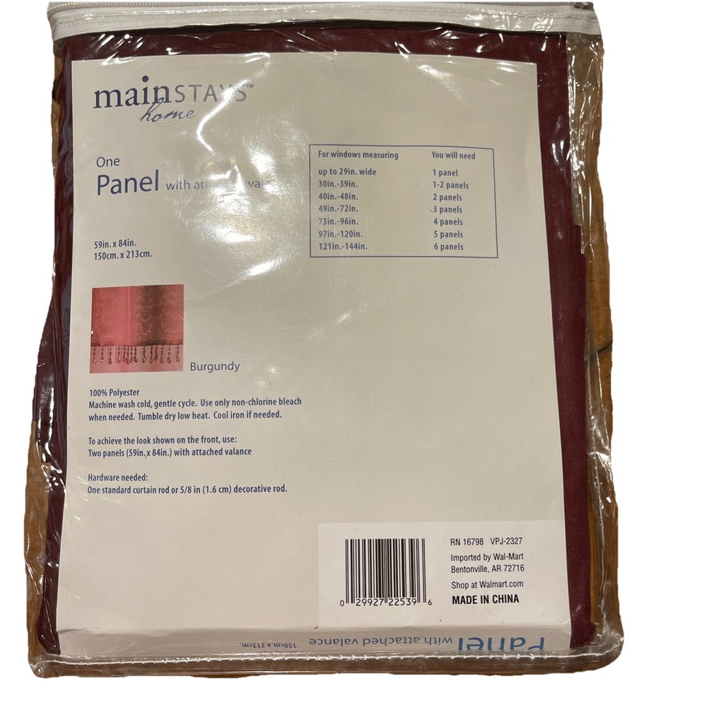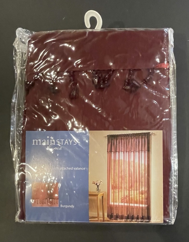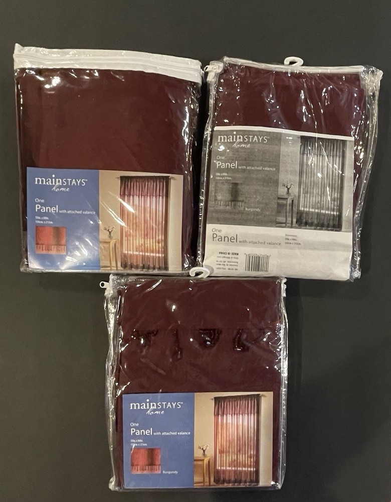 3 Mainstays Window Panel with attached Valance with Beads Burgundy 59”W X 84" L One is new in unopened package Two are new in open packages