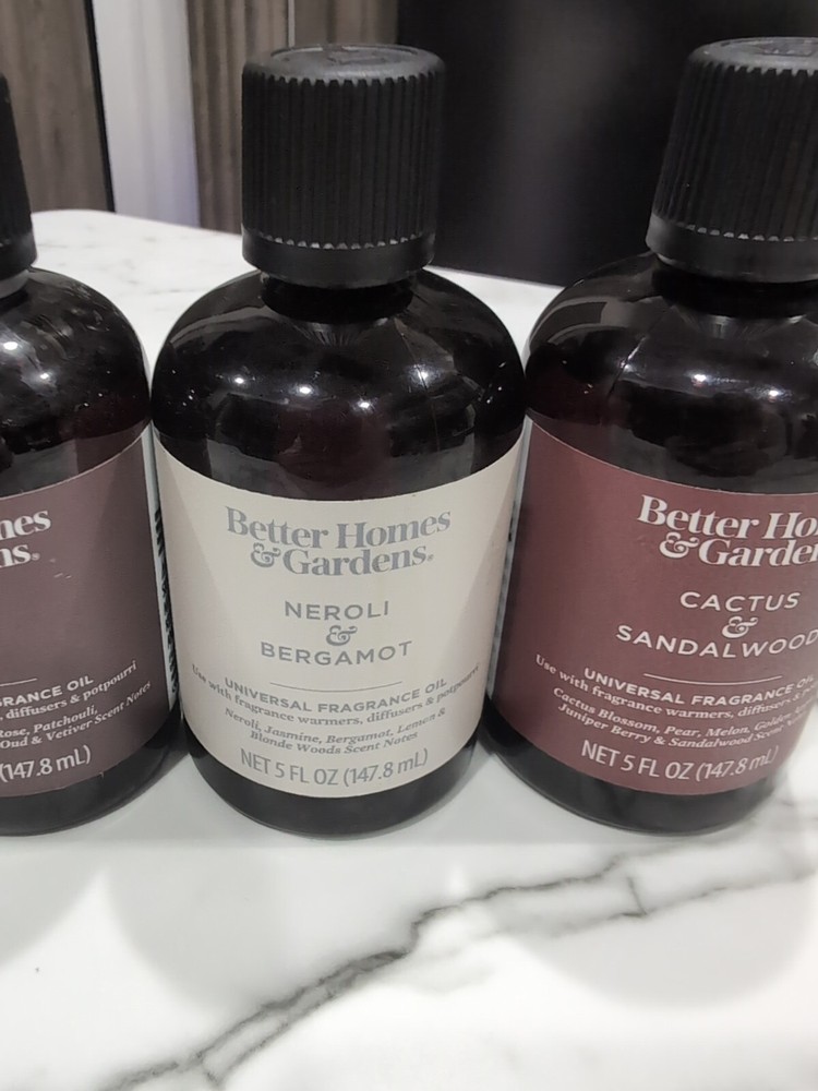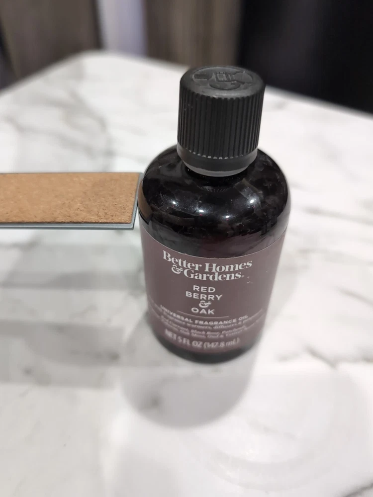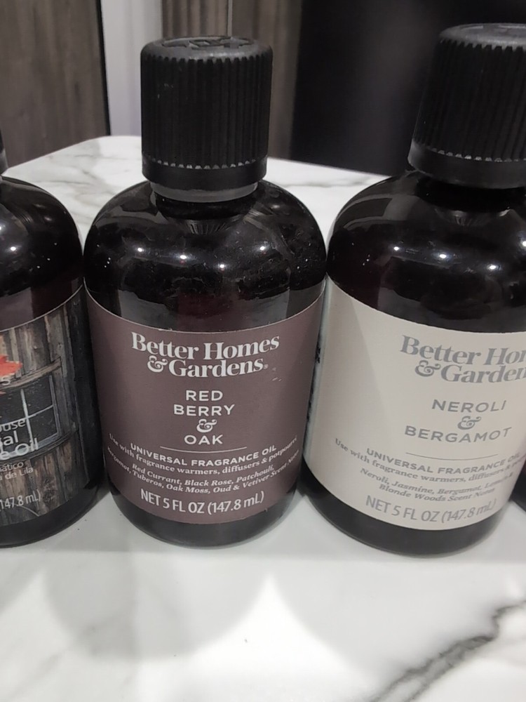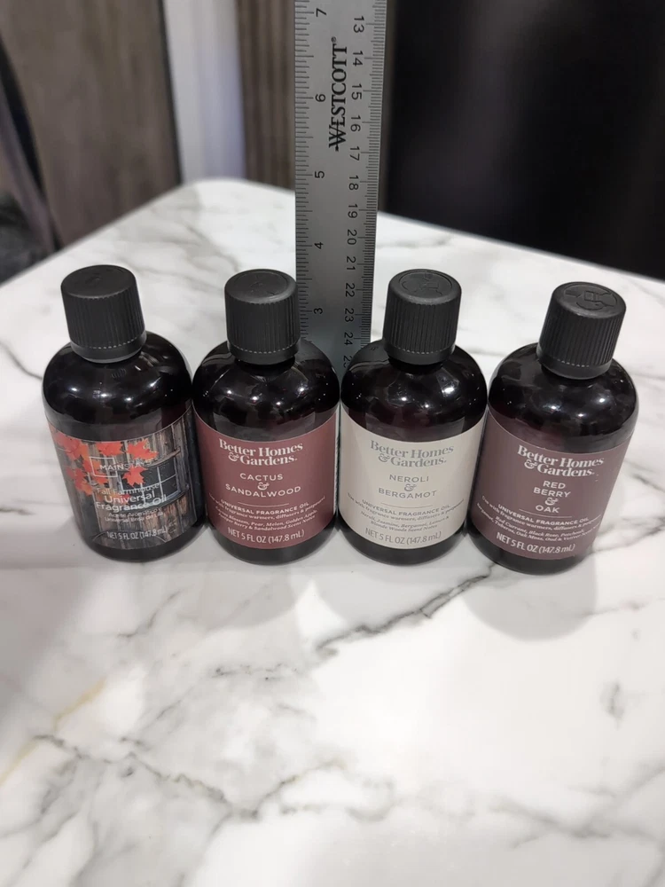 This is a pack of 4 OPENED Universal Fragrance Oils (3 bottles of Better Homes & Gardens and 1 bottle of Mainstays.) Pictures show a ruler line to indicate how much is in each container. Each container is 3/4 full. SCENTS: #1 Red Berry & Oak #2 Cactus & Sandalwood #3 Neroli & Bergamot #4 Fall Farmhouse Add a touch of farmhouse charm to your home with this 3 pack of Better Homes & Gardens Universal Fragrance Oils and 1 Mainstays Fall Farmhouse. With a variety of scents including Neroli & Bergamot, Fall Farmhouse, Red Berry & Oak, and Cactus & Sandalwood, these 5 fl oz bottles are perfect for creating an aromatic atmosphere in any room. Ideal for Christmas or holiday occasions, these fragrance oils are suitable for installation in any aromatherapy oil device. Made in the United States, these scented and essential oils are perfect for adults who enjoy aromatherapy. PLEASE NOTE that as a seller, 90% of my sourced items are pre-owned and therefore I cannot guarantee their original environment including but not limited to absence of scents or allergens. Any known defects will be listed and/or pictured.