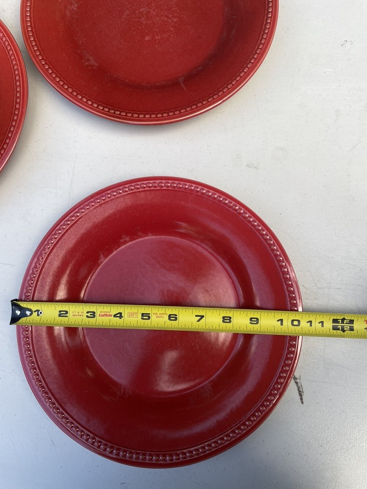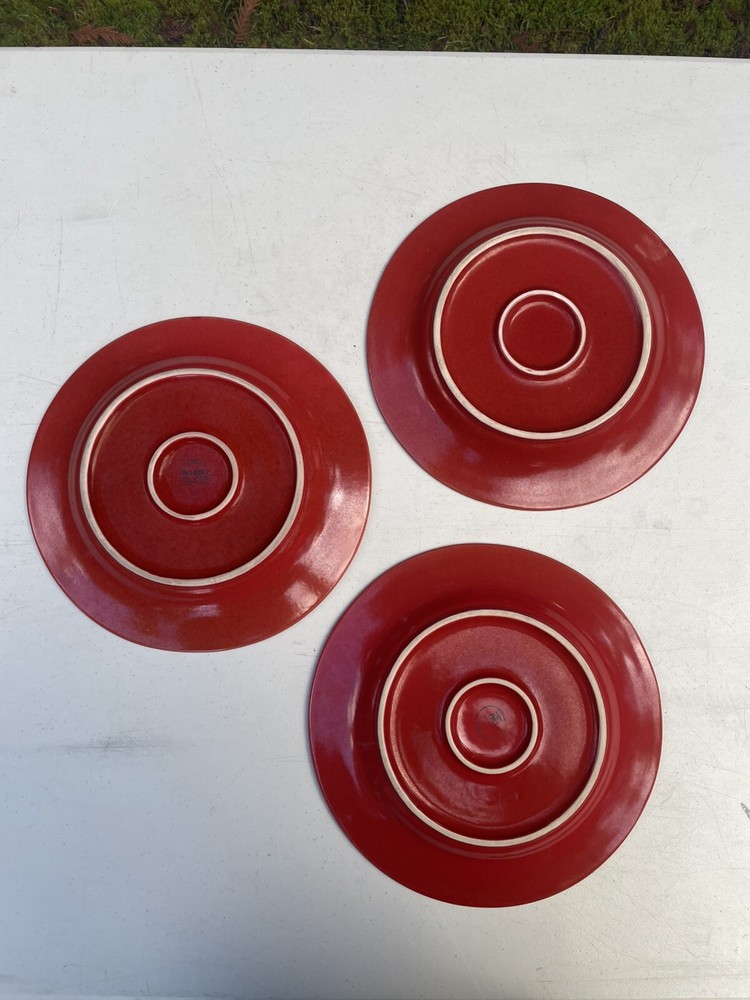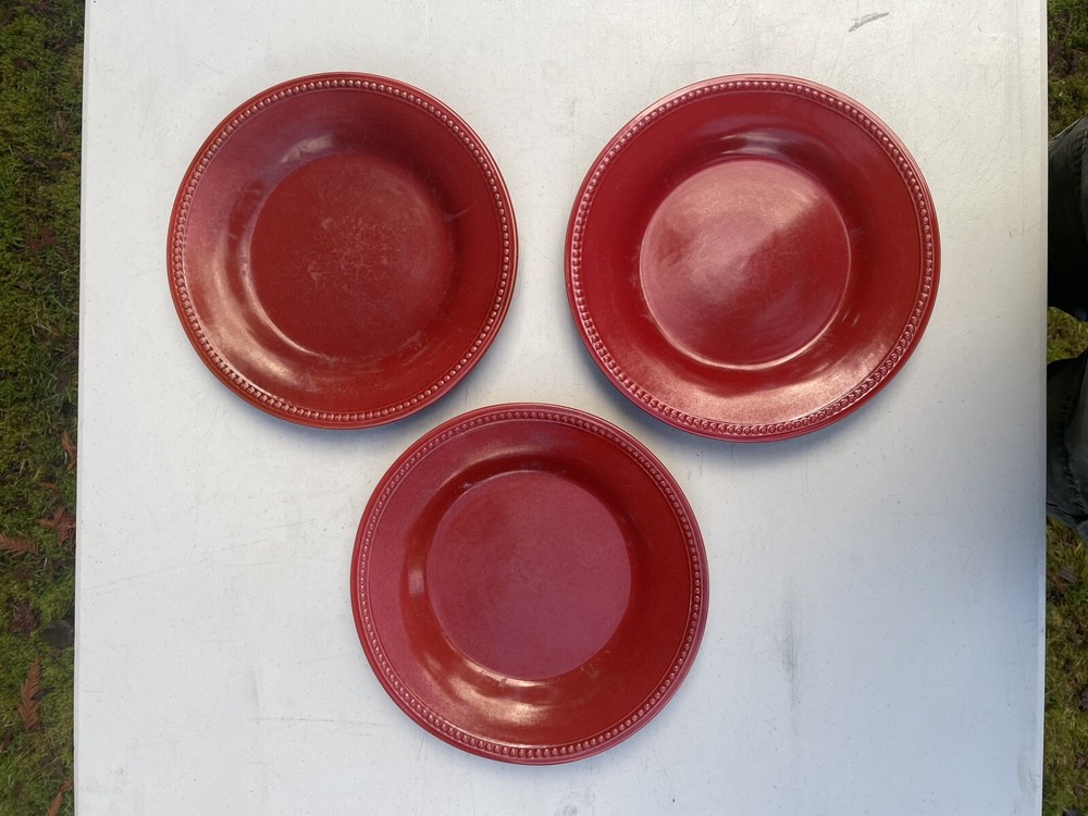 (3) PIER 1 'Spice Route' 10 ¾ " DINNER PLATES: Beaded Rim; Paprika Red No chips or cracks some minor scratches from normal use. Good condition. See my other listings for more color and size options. These Spice Route dinner plates help define your table in intriguing ways! A lively mix of pumpkin-color hues mingle in Nutmeg Orange's plate center & sloping sides. Along the round rim, embossed bands enclose an eye-catching raised-relief beading. A sleek glaze covers all, & brings out individual dappled color accents. As with all Pier One "Spice Route" pieces, such complementary & contrasting orange w/ brown flecks allow for many mix-and-match options. Spice Route excels in organic-looking table settings, or wood-hued rooms. Please see photos- (3) Pier 1 'Spice Route' Nutmeg Orange Dinner Plates measure 10 ¾ " wide in diameter & stand 1 ⅜ " tall. Very solid, durable feel. Sides angled to hold food & sauces w/o spills. Microwave-safe & Dishwasher-safe. No chips, cracks or crazing. Minimal surface marks. Produced exclusively for Pier One in China FAST SHIPPING!