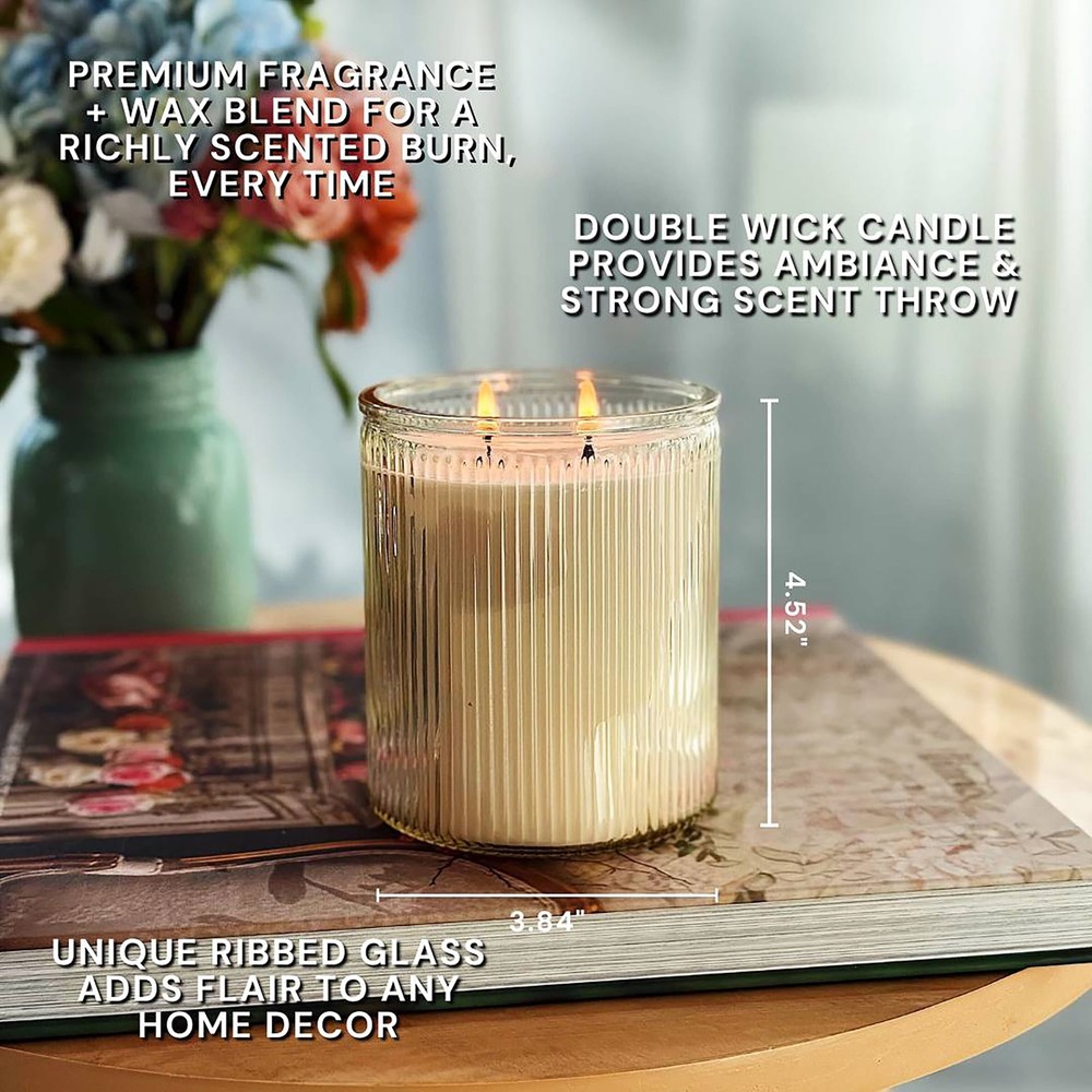 Absolutely love this candle set! The salted coconut and mahogany scent is rich and luxurious—perfect for creating a cozy vibe. The two wicks give off an even burn, filling the room with warm citrus, woody, and creamy vanilla notes. The ribbed glass jar adds a touch of elegance to any space, and the fragrance lasts for hours. Great value for a three-pack—highly recommend!