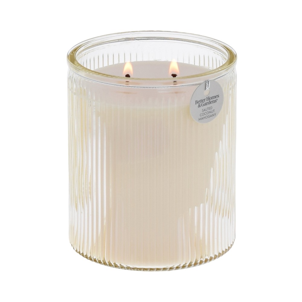Product details Better Homes & Gardens Salted Coconut & Mahogany Scented 2-Wick 17.1oz (480.77 g) Ribbed Jar Candle - Emitting a warm, golden light, this candle fills your space with an indulgent fragrance. Notes of Citrus, Herbal, Wood, Coconut & Vanilla create a delightful atmosphere. The ribbed glass jar houses a paraffin wax blend ideal for various rooms and décor styles. Crafted with care, this candle features an embossed ribbed glass design with a 2-wick design for a consistent, pleasant burn experience. Its versatile, contemporary style seamlessly integrates with any décor. Scent Notes: Citrus, Herbal, Wood, Coconut & Vanilla Includes: 17.1oz (480.77 g) Ribbed Jar Candle Wicks: 2 Wax: Paraffin Wax Blend Burn Time: 40 Hours Why you’ll love it: Customers will love this candle for its inviting fragrance, stylish design, and consistent burn, making it a versatile choice for enhancing any space. Fragrance Pro Tip: Let the wax harden before relighting, touching, or moving. Country of Origin: Imported