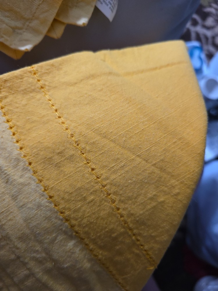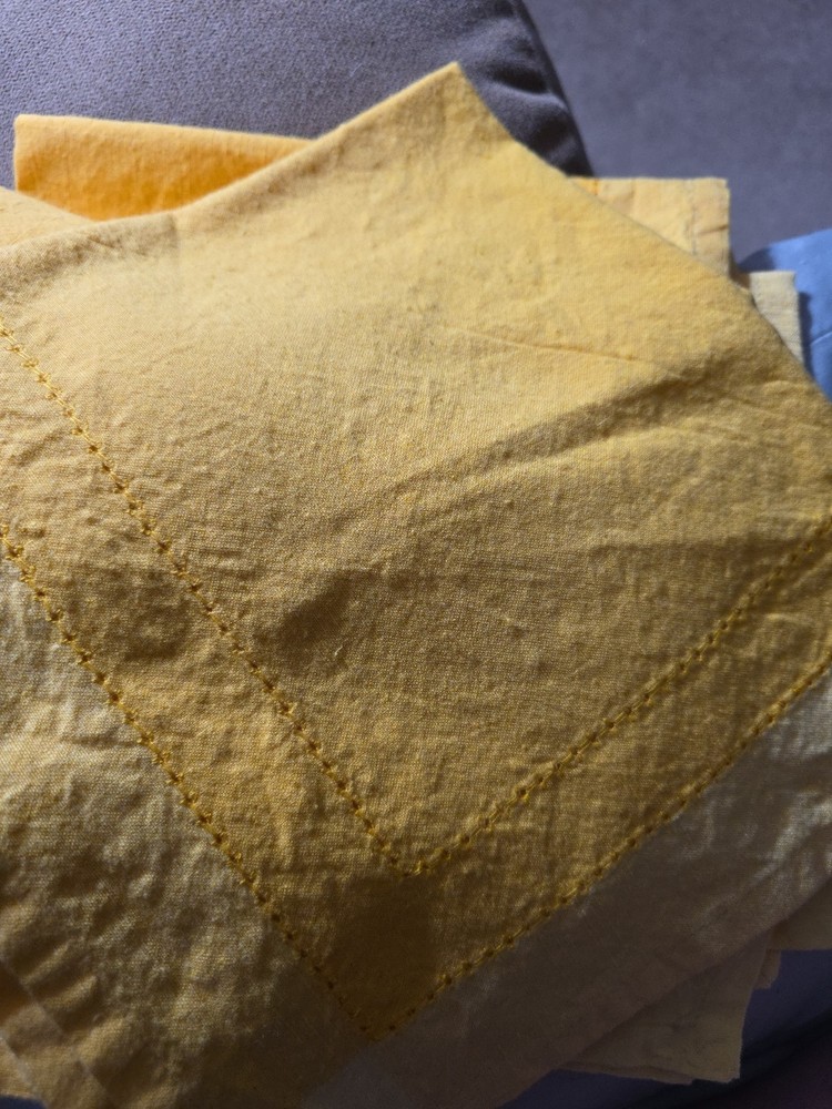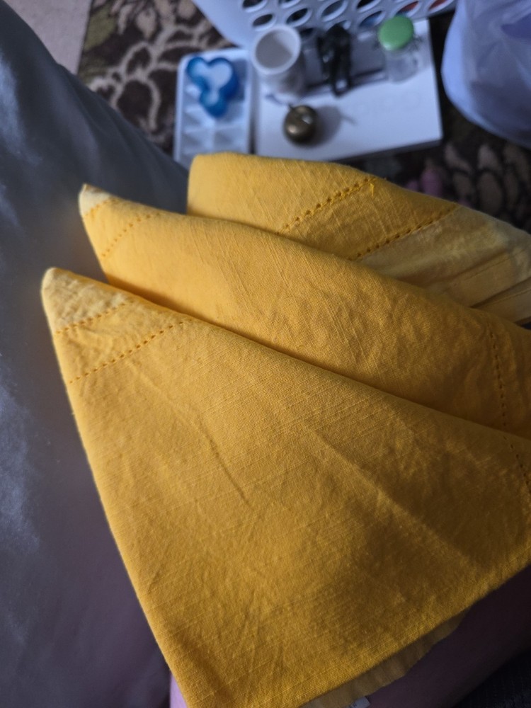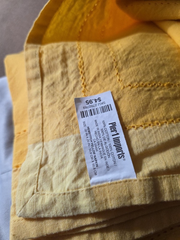 The product is a set of three Pier 1 Hemstitch yellow napkins, made of cotton and imported from India. These square-shaped napkins feature a hemstitch pattern and come in a vibrant yellow color, making them versatile for various occasions. The set of three napkins is perfect for adding a pop of color and sophistication to your dining or dining area, while also being practical for everyday use.